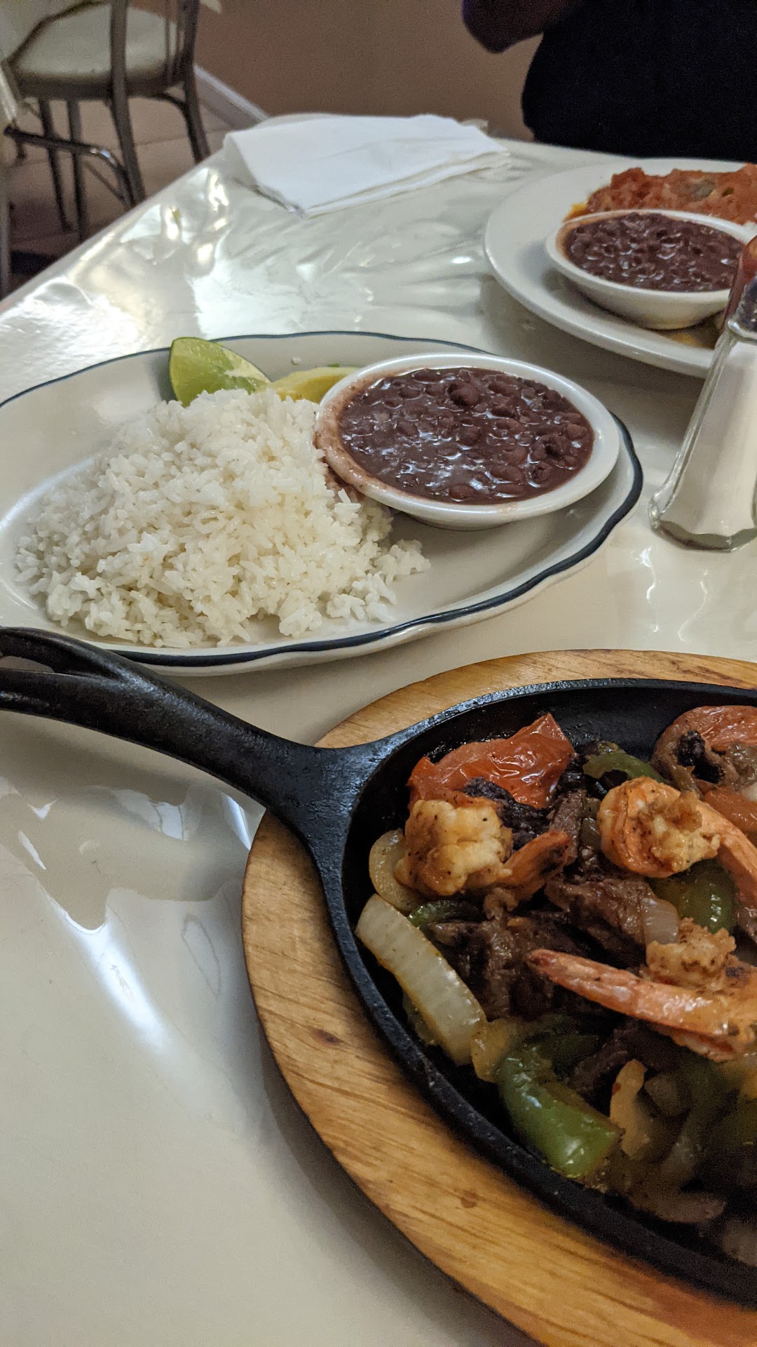 The food was ok. Maybe I'm just used to Americanized food. I wasn't expecting a plate of white rice, with a 1/4 slice of avacado, and soupy beans. I ordered the chicken and shrimp (ordered it at pollo y chamarones), and received steak and shrimp. The waitress didn't speak English so she didn't understand. Pointing at the menu didn't work. My friend Pollo y queso and received a piece of chicken with stewed tomatoes on top and a large chunk of white cheese on the side of the dish.