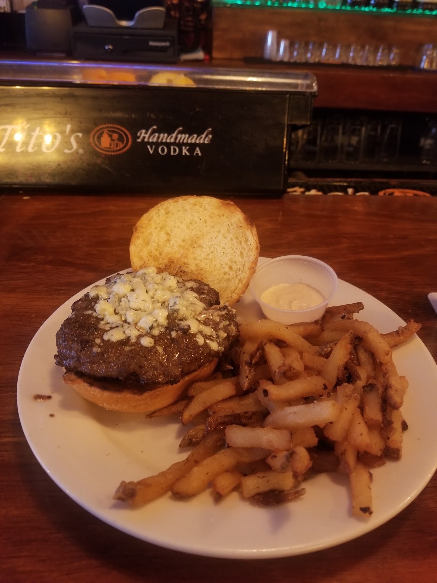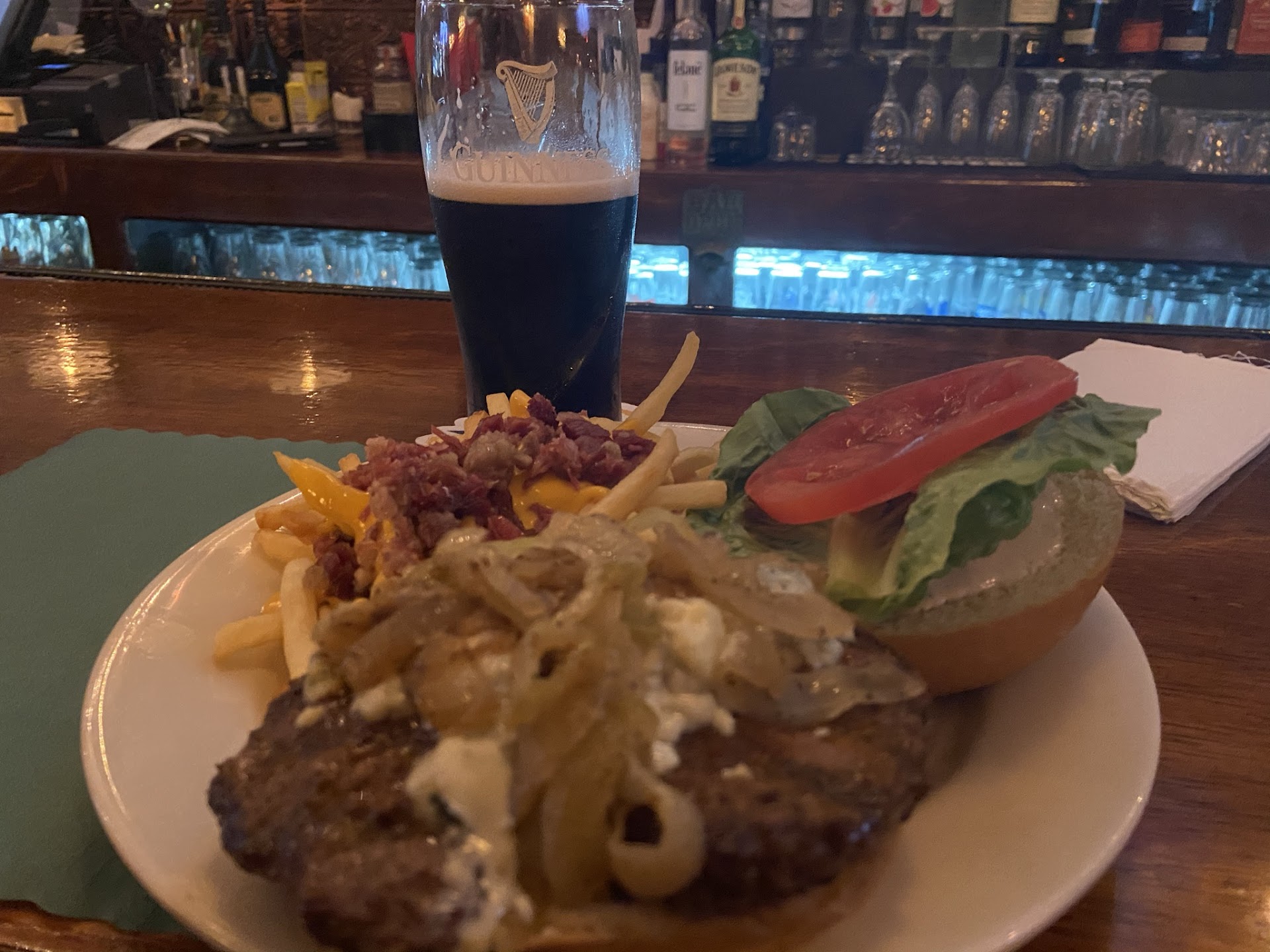 Honestly, one of the worst burgers I've ever eaten in my life.... We went for a band. Ordered beers and the first 2 were completely flat, but they tapped a new keg and made up for that so that is fine. The pretzel app was ok but they ran out of cheese and didn't tell us until the pretzel was already out. Wings were bland, slightly overcooked and half didnt even have sauce on them. The fried pickles were the only good item from the whole night. Fish and chips were basically tasteless and the fries were cold. The burger was ordered as super rare, but what was delivered was a bland beyond well done hockey puck with basically 1 slice of the little cherry tomatoes. I can without question say that I had a better at the food court of the bronx zoo. We went as a family of 6 and literally every single person threw half of their meal away because it was that bad. We would have said something about the food but after it was delivered we never saw the waitress again until we finally got tired of waiting and tracked them down to just pay and get out of the place. Without a doubt, one of, if not the worst meal I have ever had to dish out $175 to pay for. Not to mention the fact that when the food came out, they spilt coleslaw on me and just completely ignored it. I honestly don't understand where these good reviews are coming from. I assuming it's a bunch of regulars or staff? As mentioned, without question, the worst meal I have ever had at any eating...