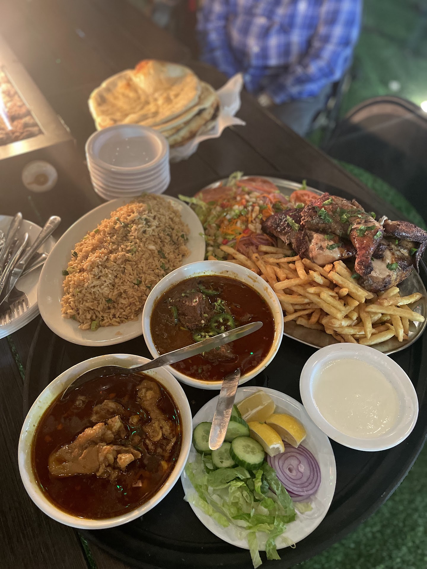 Food: 5 Stars 🌟 We ordered the Rotisserie Chicken/ Peruvian whole chicken for family which comes with rice, fries and salad. OMG so delicious and combined with the perfect blend of what I assumed to be Peruvian spices. Nihari was top notch. Paya were pretty decent. In desert, we loved the gulab jamun and rus malai. Chia was perfect Dood Patti.
