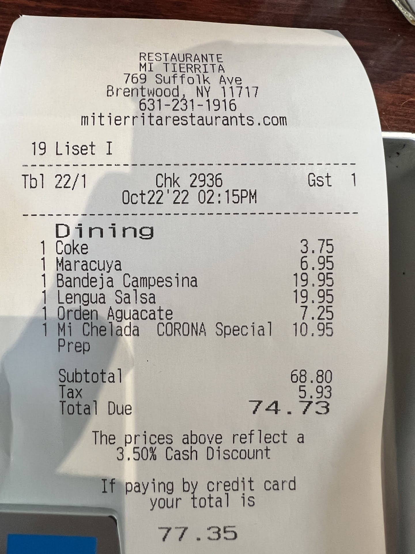 es tuve en mi tierrita restaurante en brentwood i la senora que travaja es vien ruda con los clientes estava comiendo i me grito que me pusiera la mas cara para comer ai para ir al vano ella cre aselo vien pero no es ruda yo no regresaria aese restaurante ya que des pues la llame para en senarle lo que salio en la comida entre medio del arroz i los frijoles estava un a metal del lavaplato 2 pulgadas de largo seve que son vien descuidados i muy rudas alpareser es la duena del restaurante no recomiendo ese restaurante ya que es muy ruda la senora i peligroso puede tener acidentes con esos suciedades en...