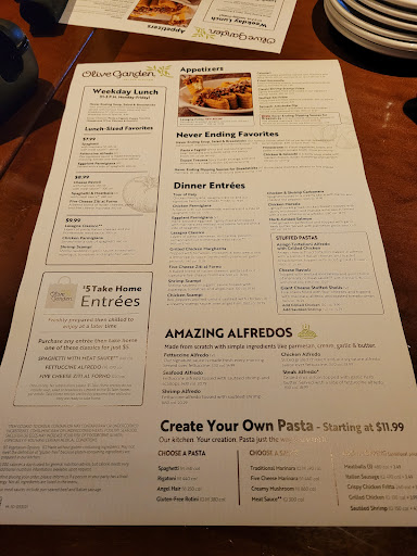 Read moreHaven't gone to Olive Garden in a few years because if we want Italian food we prefer local family owned rather than chain restaurants. We had gift cards which is why we went. That being said, I was pleasantly surprised at the food. For appetizer, we got the spinach artichoke dip which was decent, but the little flatbread chips they serve it with are excellent. They're crispy on the outside (fried I think) but they're surprisingly soft and fluffy inside. I ate them with the artichoke dip and a side of alfredo sauce we ordered. We also you mozzarella sticks which were also good, but the marinara sauce on the side was actually better than I expected from a chain restaurant. It's miles better than the "seasoned ketchup" that some other places try to pass off as marinara. For dinner I got the stuffed shells. They were perfectly cooked and the stuffing of mozzarella and ricotta we creamy and delicious. The sauce that went with it was again better than I remember it being from past experiences at the Olive Garden. The only complaint I had was for the bread sticks. They are usually my favorite thing but they were pretty dry and a little hard. Almost stale. I remember them being much softer and buttery. Overall, I think it was much better than my last time going which was probably close to...