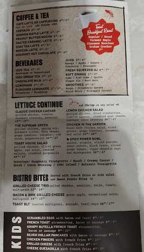 Read moreWe went to Toast in a Tuesday around noon. Both metered parking lots were full. We happened to go as they were setting up for an outdoor concert in an open gazebo area across the street ( and diagonal) from Toast. We did finally get a spot about a block and a half away. We were sat right away. I would say the dining room was almost full. We were just two people but were sat at a table for large parties and were told if necessary they would sit another couple on the far end of the table. Which eventually did happen. There are also some tables outside. They adverise that they are pet friendly in that area. Our waitress came over fairly quickly and took our drink order ( 2 ice waters, i know , dull) while we looked over their fairly large menu. My son oredered a short stack of sweet potato honey butter pancakes and asked for real maple syrup which they give you for a $2.00 upcharge. And he also ordered a side of french fries. I ordered the grilled cheese trio with french fries and a pickle. The food was brought out fairly quickly and I have to say they were hearty portions. My son loved his pancakes with the honey butter and I really enjoyed the grilled cheese. Nice thick bread, grilled to perfection with three different cheeses( american, cheddar and swiss) and a couple of slices of tomato , a full pickle, not one of those half jobbies you get elsewhere, and a large portion of french fries which reminded me of Checkers French Fries. Very tasty meal. Our waitress was attentive, the food was very good, the noise level was low- key and it was easy to talk across the table. We will be...