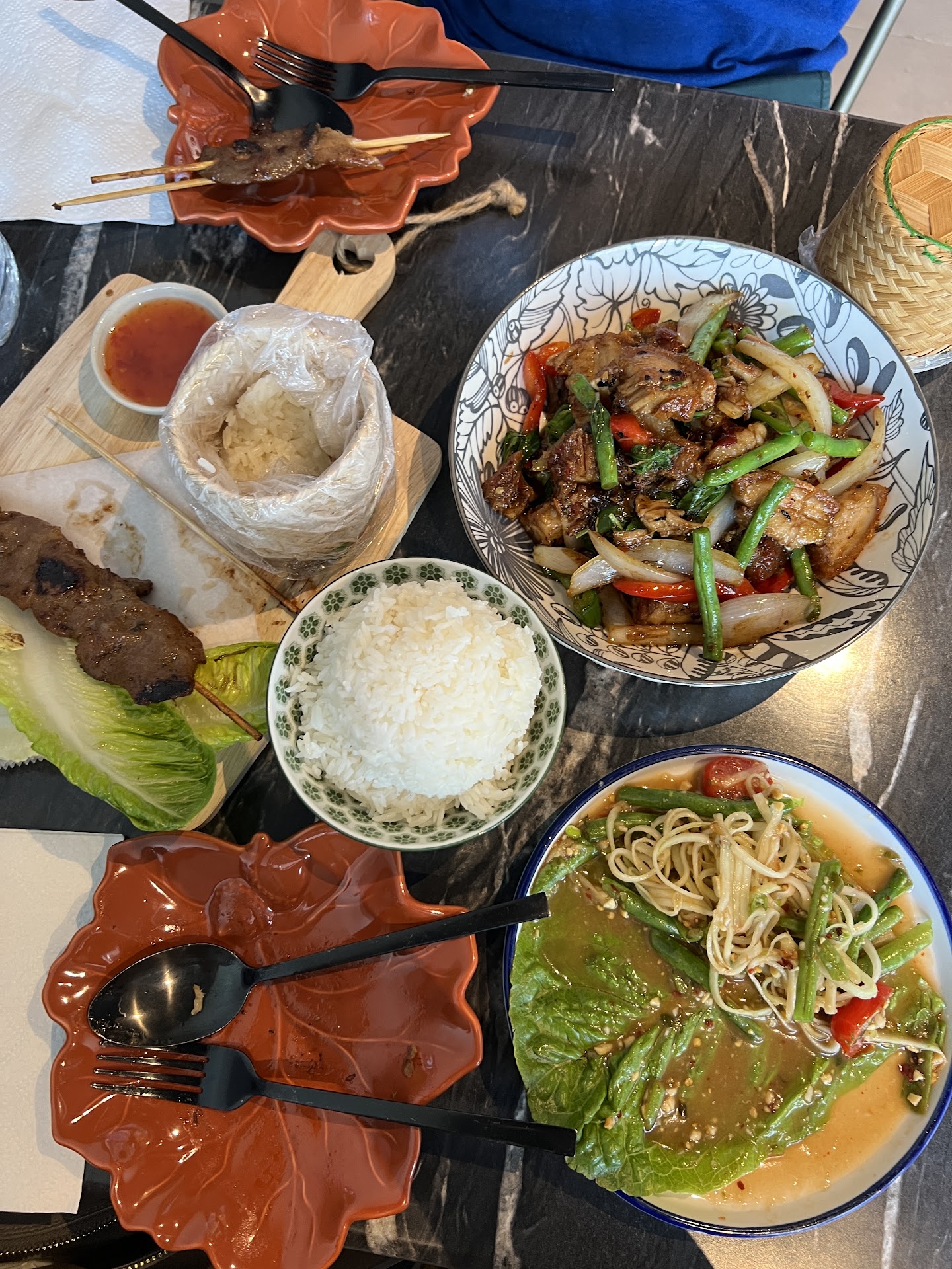 We ordered the crispy pork belly, clams basil, shrimp basil, shrimp salad, and beef satay. The beef satay and shrimp salad were good, but the other dishes really missed the mark. The crispy pork belly was dry, chewy, and overwhelmed by sauce. Both basil dishes were also very heavy on sauce and onions, and overall far too salty. It felt more like a Chinese interpretation of Thai food. We also requested medium spice, but the heat level was far below that.