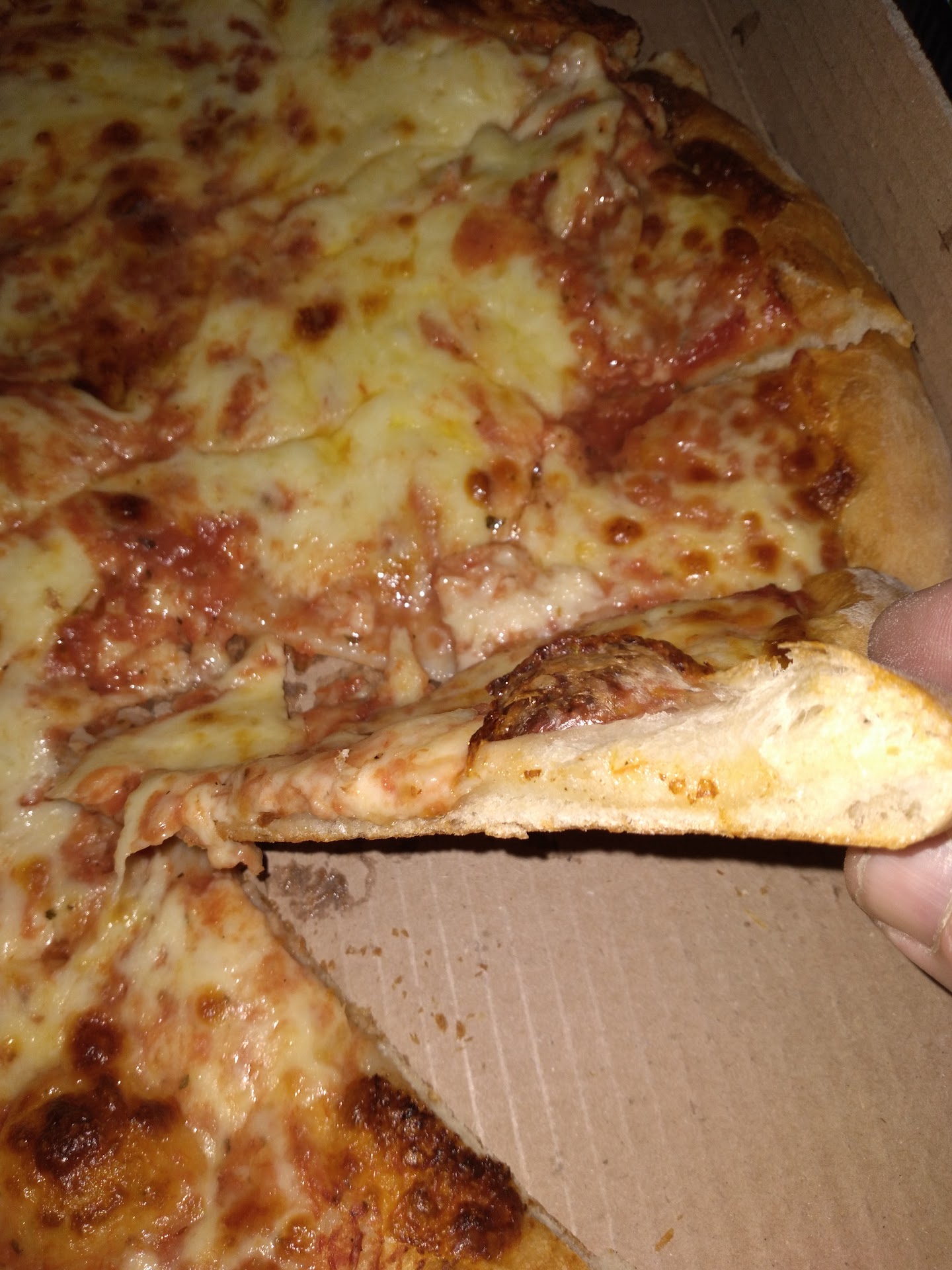First things first; I ordered my standard âreviewâ pizza, a pizza with extra cheese, and the pizza showed up with much of the cheese pooled to one side. That is a major negative, as it showed a lack of attention to the product showing up to your door in reasonable condition. So, putting the cheese-slide aside, this pizza was overall tasty. Ithaca NY has a pizza problem, in that much of the pizza is horrible. There are a handful of worthy places, and a good slice in Ithaca will certainly stand out; especially if you have had the bad. This pizza did not disappoint in the way of flavor, and is worthy of your taste buds. The sauce was saucy, not thick, not thin; good flavor that complemented the cheese and dough. Speaking of the dough, it was fairly good, weakish, an ok texture, not over the top, but not scraping the bottom. I would buy this pizza again.