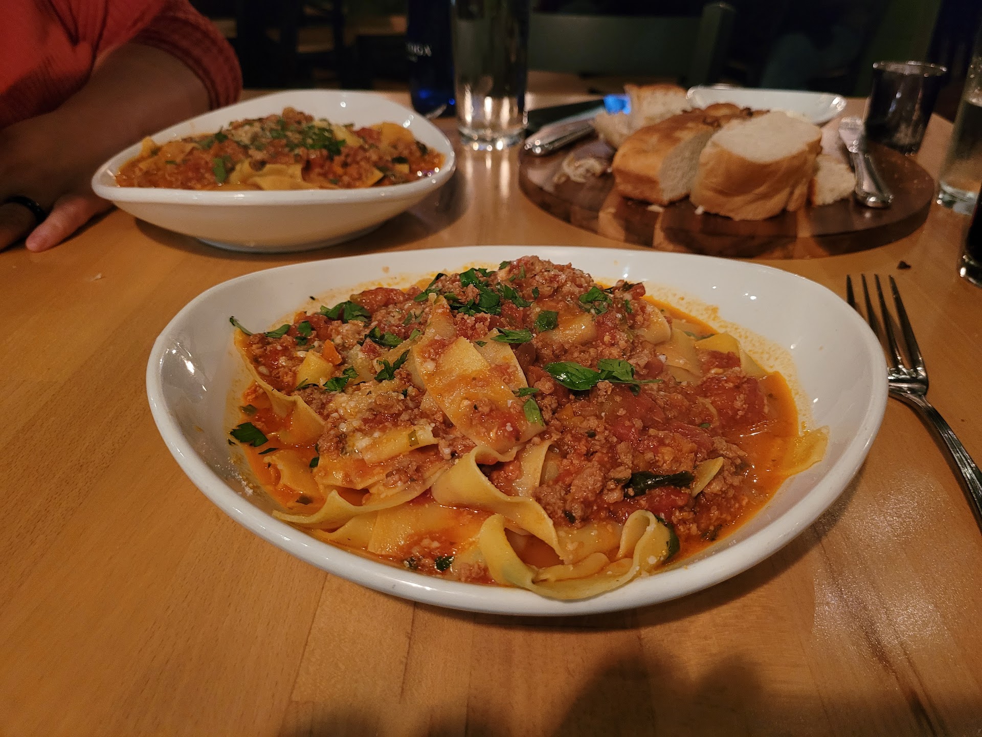Our server was prompt and polite. We first ordered a round of drinks which we very much enjoyed. Next, we ordered the bread plate appetizer, as other reviewers alerted us to the fact that Saluti does not provide bread for the table. This was a disappointment. We saw other tables around us order the bread plate, and theirs displayed a nice variety of breads, including one that looked nicely grilled. When ours arrived, it only contained two types of bread, both of which were quite bland. It was nice, however, that the plate included a delicious butter and a grilled bulb of garlic. More consistency would be appreciated with this appetizer. We also ordered a Ceasar salad as an appetizer. When we asked for ground pepper, the employee did not know what it was, despite explanation and asking others. This is a great learning opportunity for management to train all employees, including food runners, on these details.