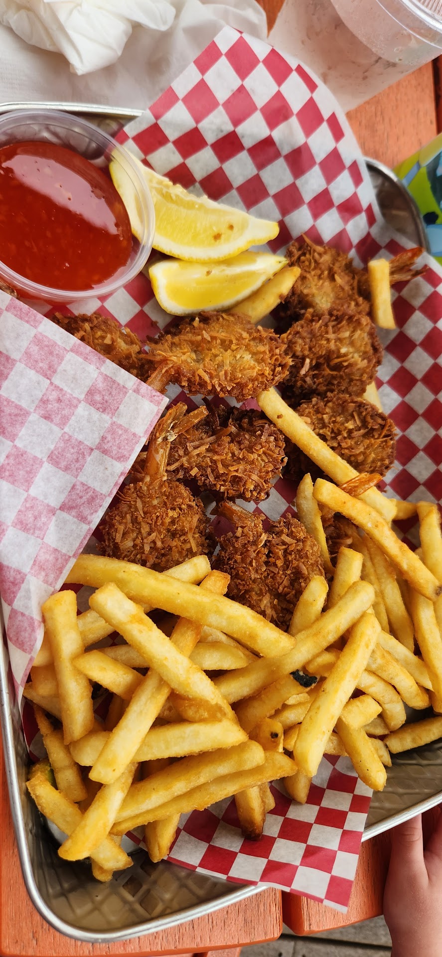 The food tasted like it was all frozen, pre-breaded Sisco. Which can be fine, but the prices were not in line with the quality of food being served. Their tacos were $18 for two pre-breaded, frozen, cod tacos, which looked like a total of 3 oz of fish between them both... everything is served with a very large bunch of fries, which take it for what you want. The calamari was overcooked. And the coconut shrimp are again pre-breaded and frozen and overcooked. They were realistically 31/40 size butterflies and...