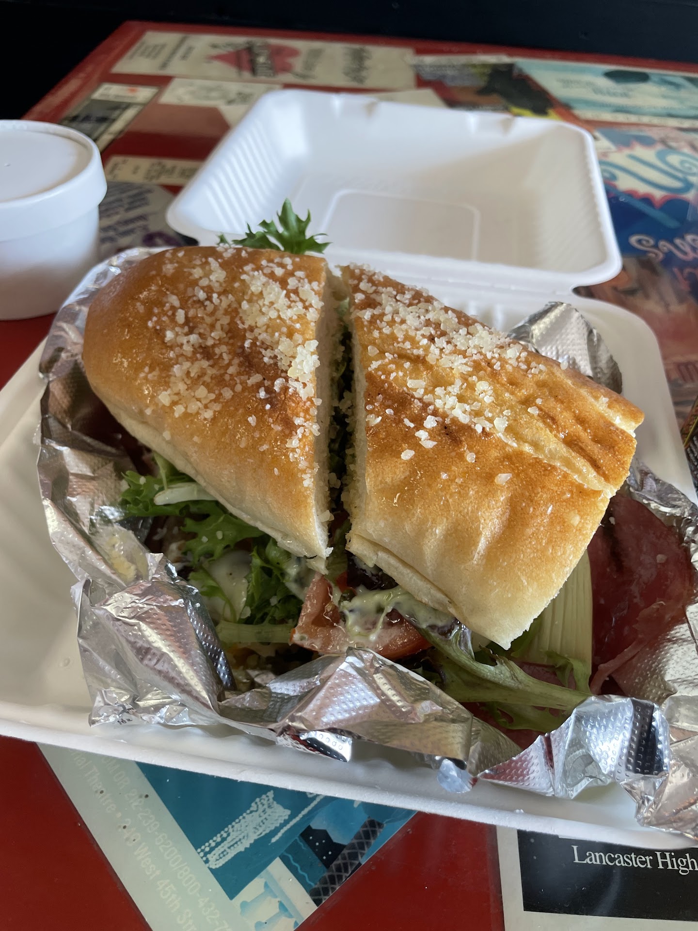 The decor is pretty and colorful. It is much quieter and less chaotic than the Broadway Deli in Manhattan. I used to go there after plays when I lived in NYC. The tables have playbills sealed into them and the walls are covered with signed autograph photos of actors. They have various songs from plays coming from the overhead speakers. You can enjoy your meal...