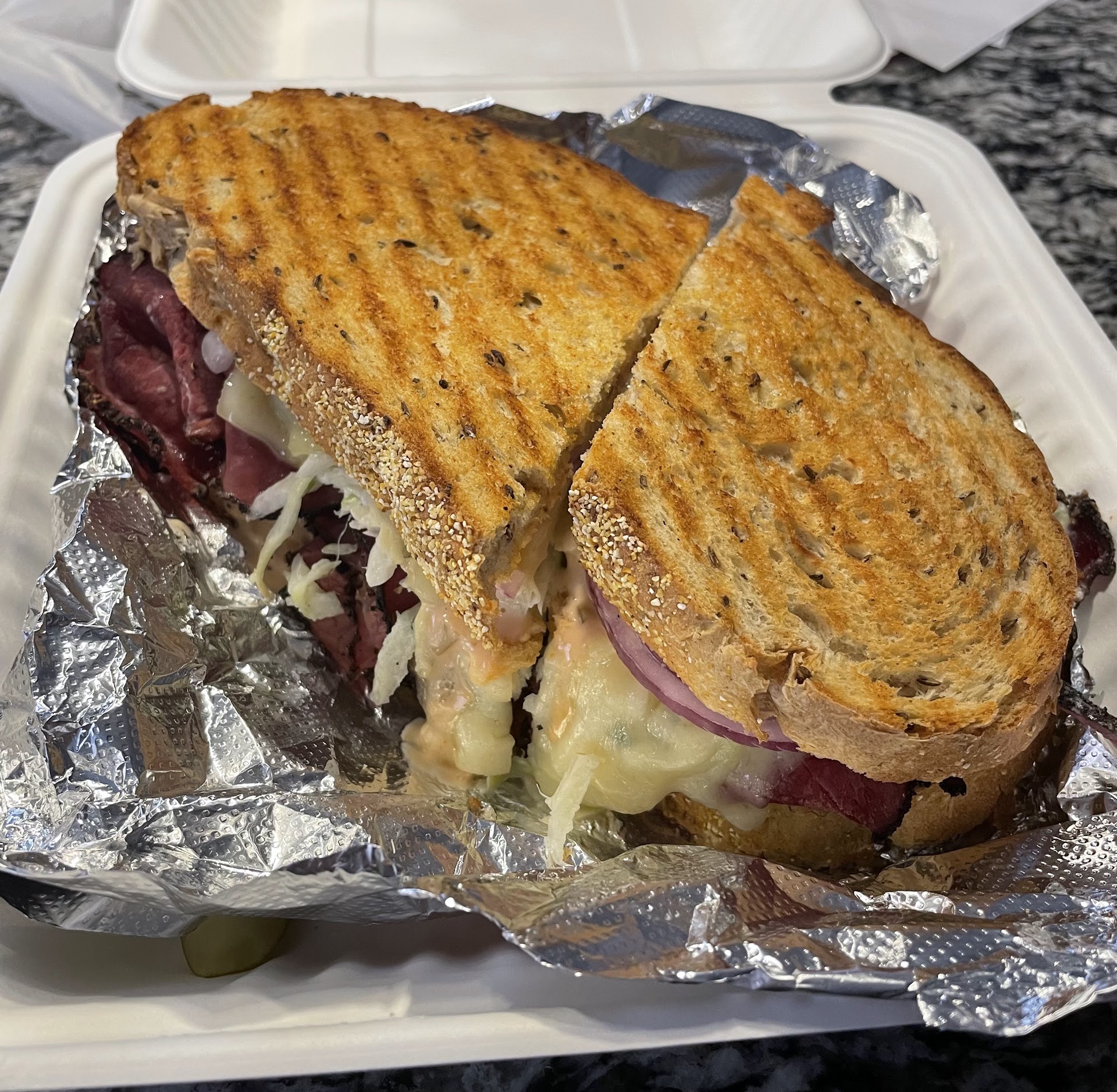 First off we ordered take out from here so I can't describe the actual place just the food. I ordered the bbq pulled pork Panini which came in a torpedo roll and a bowl of chili. Unfortunately the chili wasn't in stock so they gave me Chicken Tarragon soup instead. My favorite part of the meal was the soup, it had such a rustic and home like taste that I was blown away. If all their soup is like that I would go back on that alone. My second favorite part was the deli pickle which I can never pass up. As for the sandwich I was less impressed by. The biggest issue was the roll wasnt toased and made the whole thing suffer for it. All my other issues with it were more personal preference. I wasn't a fan of the cheese or the bbq sauce (too sweet for me I prefer smokey). The rest was fine but without the crunch of a toasted roll it was texturally one note. I should also mention my coworker got the Reuben sandwich which he liked a lot but also was disappointed on a non-toasted roll as well. I would definitely recommend checking the...