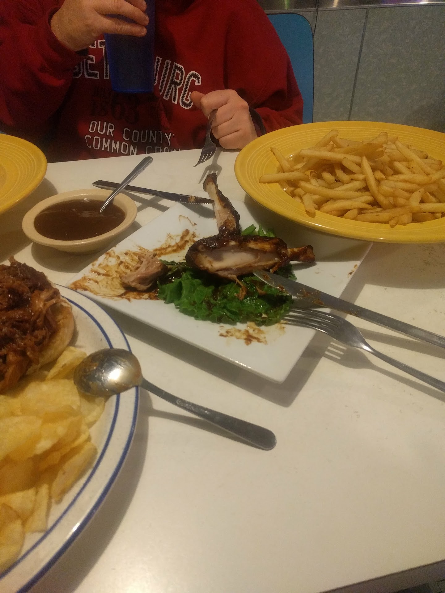 Read moreReal 50's Diner in the heart of Depew. The speciality of the house is Pig, in all it's BBQ glory. I had the pulled pork Sandwich with BBQ baked beans on the side. The pork was a huge helping of real Q'd pork. Moist, tender and the house sauce is not to be missed. I had the regular sauce and it was just sweet enough, with a smokey snap to it, Yummy. Beans had the Cherry sauce which was tangy fruit but not over done, a nice balanced sauce. I snapped it up with some Tabasco and had a mighty nice meal . I tried 3 sauces in all and they were all unique and calling me back for more. Chicken Alla KIng was the special of the night and considering what a cold wet snowy night, it was the perfect comfort food, a heart warming dish for my companion. Rich tasty gravy with chunks of chicken and veggies over 3 home made biscuits and a huge helping of creamy mashed potatoes that I could not stop eating. It was a huge platter but it was all gone in no time and the bowl licked clean ! The star of the show, no doubt, are the HAWG wings ! Tender drums of lovingly BBQ'd pork with a perfect glaze of their house sauce, were most succulent bit of pork I have never heard of ! All meat and it tugged off the bone in the way that says perfection in Q. HUge menu served super quick and friendly by waitress Brittany. We will be back for more, breakfast, dinner and...