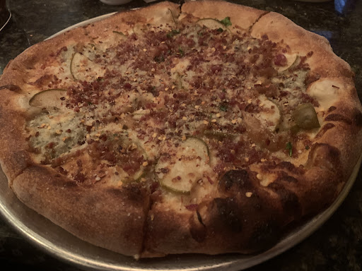 For an appetizer - I ordered the Arancini. The order comes with three good-sized balls of risotto and the perfect mozzarella ratio. The sauce the appetizer basks in is, dare I say, drinkable?! Wow-the Pomodoro and pesto should be bottled and sold in 20oz. options! I ordered a pizza for my main course - not just any pizza! A wood-fired, well charred, pear and gorgonzola pizza. Wow, the taste! Wow, the yummy chewy wood-fired crust! Wow, the toppings; bacon-wow, caramelized onions-wow, thinly sliced pears-wow, salty gorgonzola that pairs well, well, with the pear-wow!