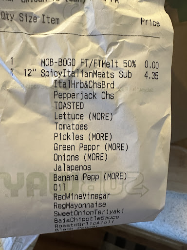 Read moreThis subway is literally the best subway I’ve ever been to. Subway is my favorite sandwich shop, and the service here is always outstanding. Not one complaint. I’m pregnant so I started to order online more. My order is a bit weird and tedious, so I always write a note about how I’d like it done. And tip when I can! MThis store is the first store to always make sure that it is made correctly. I never have to double check my sandwiches from here!! I had a BOGO deal I used for valentines day, my husband was gone so I wanted comfort food. The crew wrote me a nice little happy valentines note and went above and beyond on my order. I cried my eyes out when I got home and saw the note! Thanks for being my Valentine’s Day sweetheart, subway!...