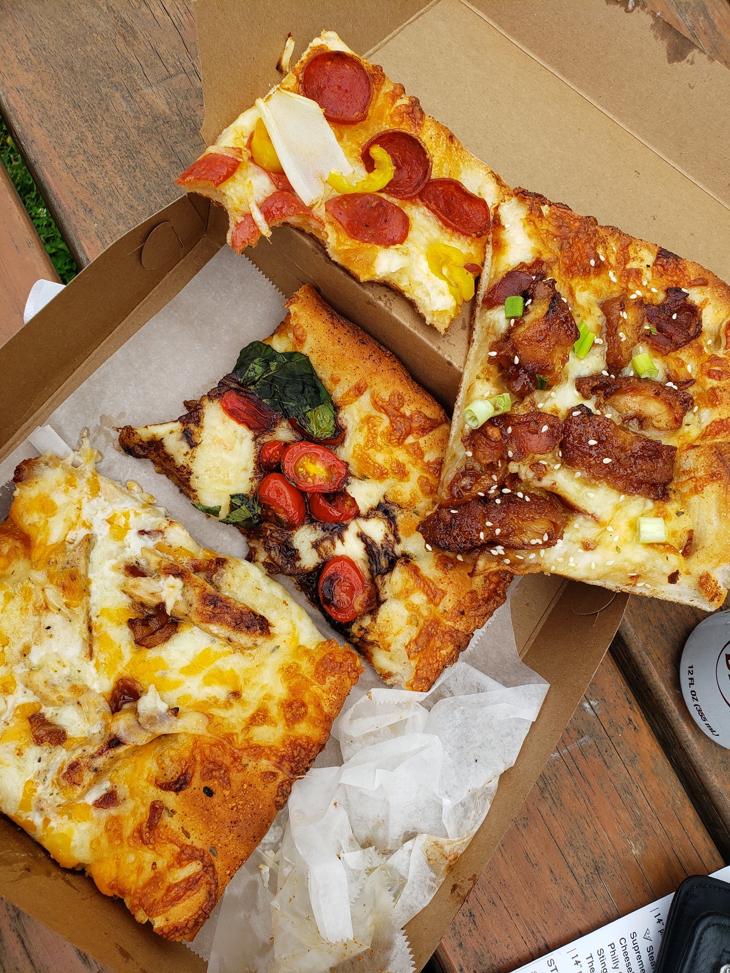 There is a wide selection of different pizzas, that you can order by the slice, and they will heat up in the oven for you. Soft drinks are available, and seating inside is clean.