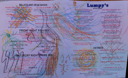 Read moreWish I had read reviews before going for a “quick” burger at Lumpys. 4 of us got seated quickly at 6:50. That’s essentially the only good thing I have to say about Lumpys. Customer Service is not their priority. We waited 15 minutes before we even saw our waitress , then another 10 to order our drinks and water. She gave us a pitcher of water and 4 glasses. Here, I’m busy, pour your own.? Still no silverware, no name to our waitress. 1 hr after sitting, we got our food. When We got our food, 1 order was wrong, so she brought out lettuce and onion in a bowl to build our own burger. She missed the part that it was supposed to be a bacon cheeseburger, but it had neither, just a patty in a bun. Our wrap had plastic wrap in it. Our waitress indicated she was sorry and would take them off the bill only to have the manager want to bill us for the burger if we waited another 20 minutes. Nope. What we heard as we walked out the door was “next time we should just eat at home” from the manager. I’m in agreement...