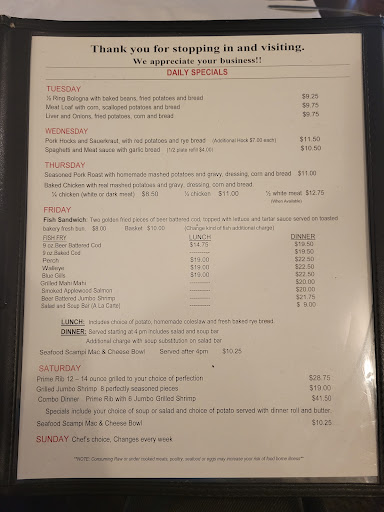 Read moreBar & Grill look. Service off appetizers came late since they did not read the ticket right. Prime rib w wild rice soup & Texas chili great. I had shredded pork w bourbon sauce over homemade mac&cheeses. oh, so good. Another had a taco on Indian bread she almost ate it all & that's saying another for her at one sitting. Two others had the southwest burger. It had jalapeños & was served with the Greek cucumber sauce, fantastic. The special Thursday night was either a full pork or chicken meal, dressing, potatoes, etc. Pie cheap, not homemade came with ice cream. Drinks are not great ok though. We get bar rail. Lots of variation on the menu. Well worth the stop. In the middle of no wear, so not busy & lots of room to park. Definitely plan on going back. Price for...