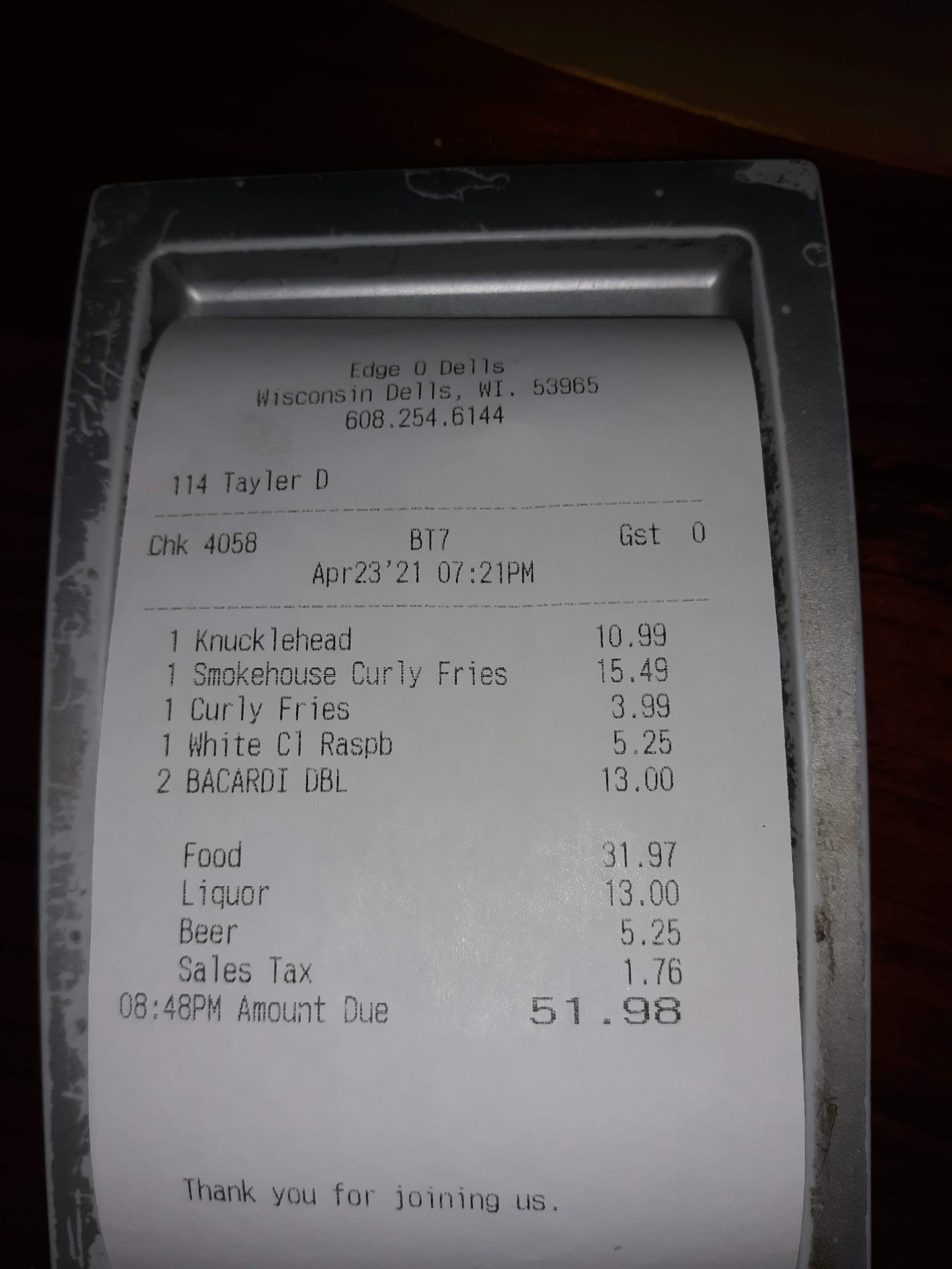 When the food came out, the sides on two plates were flopped. 2 different burgers and one w chips and one with curly fries. She set the plates down. We noticed the food was flopped and so did she. My fiance's chips were on the other couple's plate and vice versa. She acknowledged it and said she'd bring a plate for the fries to be slid off the plate. We asked that the other couple just get fresh fries brought out and she charged us 3.99 for an extra side of fries that she put on the wrong plate. I attached the receipt to this review. Then, my mayo was forgotten. I don't use ketchup, I asked for it and she went to get it but served 3 other tables and yet again forgot about my mayo. I eventually had to get up, go to the bar and ask for it. She definitely acknowledged my frustration.