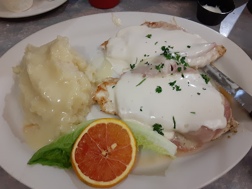 We almost didn't stop here because the outside looked a little tired and run down but the high star reviews on Google convinced us and we decided to try it. So glad we did! In fact we went back the next day because we enjoyed it so much. Don't judge this book by its cover! My husband's steak was amazing! The sear was perfect and the meat was juicy and flavorful without being over seasoned. The burger was great, the chicken continental was great (mashed potatoes and gravy could use some more seasoning) the house fries were good, tasted like Dutch oven potatoes, salad was good although I'd prefer the veggies to be cut smaller. The Italian wedding soup was AMAZING the first night, the second night we came just before closing so there weren't many meatballs left in the soup and it was too salty for my taste but my husband still really enjoyed it. They make almost everything in the restaurant homemade and the soups are made fresh daily and tossed by the end of the night, not saved and reheated (we know this because the waitress offered my husband a free cup because they were about to dump it anyway). The only thing I'm aware of that's not made in house at the desserts and I will say these were lacking in quality. I ordered the chocolate cake which was dusted with powdered sugar, it looked fantastic but when I tried it I could taste a pepper flavor. I thought it was odd and figured maybe somehow a sprinkle of pepper got on that particular bite but I kept noticing it and then my husband pointed out that it was the powdered sugar that tasted that way. He had the same powdered sugar on his banana cream pie and we tasted it plain. It was definitely that. So that kind of ruined dessert for me. The service both nights was fantastic and friendly. The inside atmosphere was cozy, the price was right. We'd definitely recommend this place, but if I had a word of advice or feedback for the establishment it would be to make the desserts in house to match the quality of the rest...