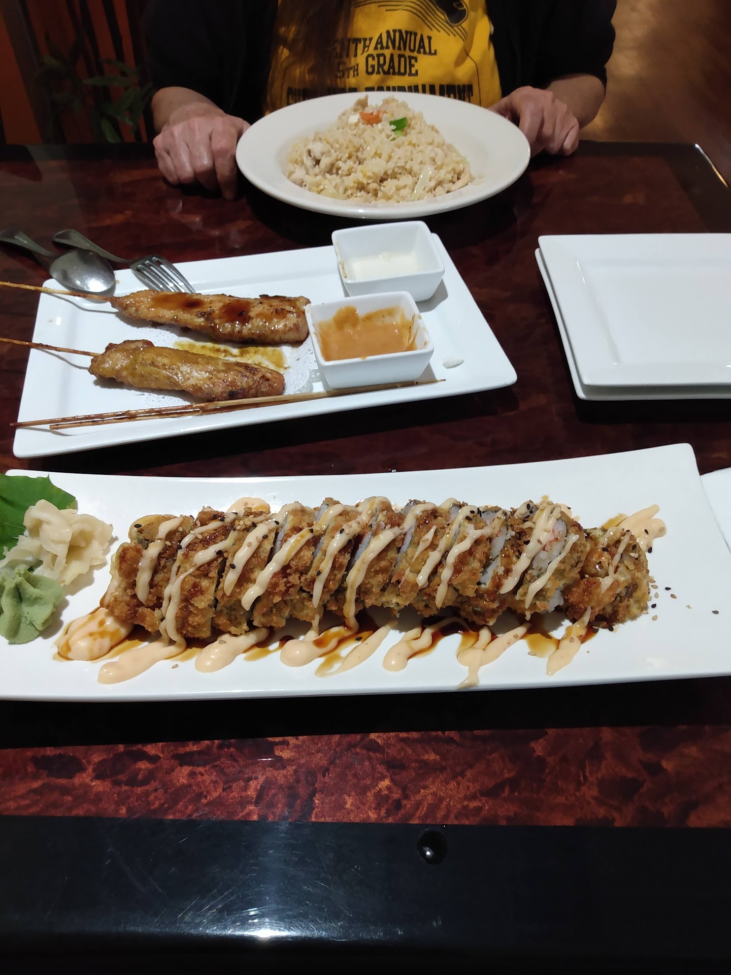 The picture here is my Dollar Tree roll, affordably priced at $11. At most other places you can't even look at the specialty roll section without spending $15 minimum. My mom got Thai fried rice. You can see the chicken satay in the middle, looking thick.