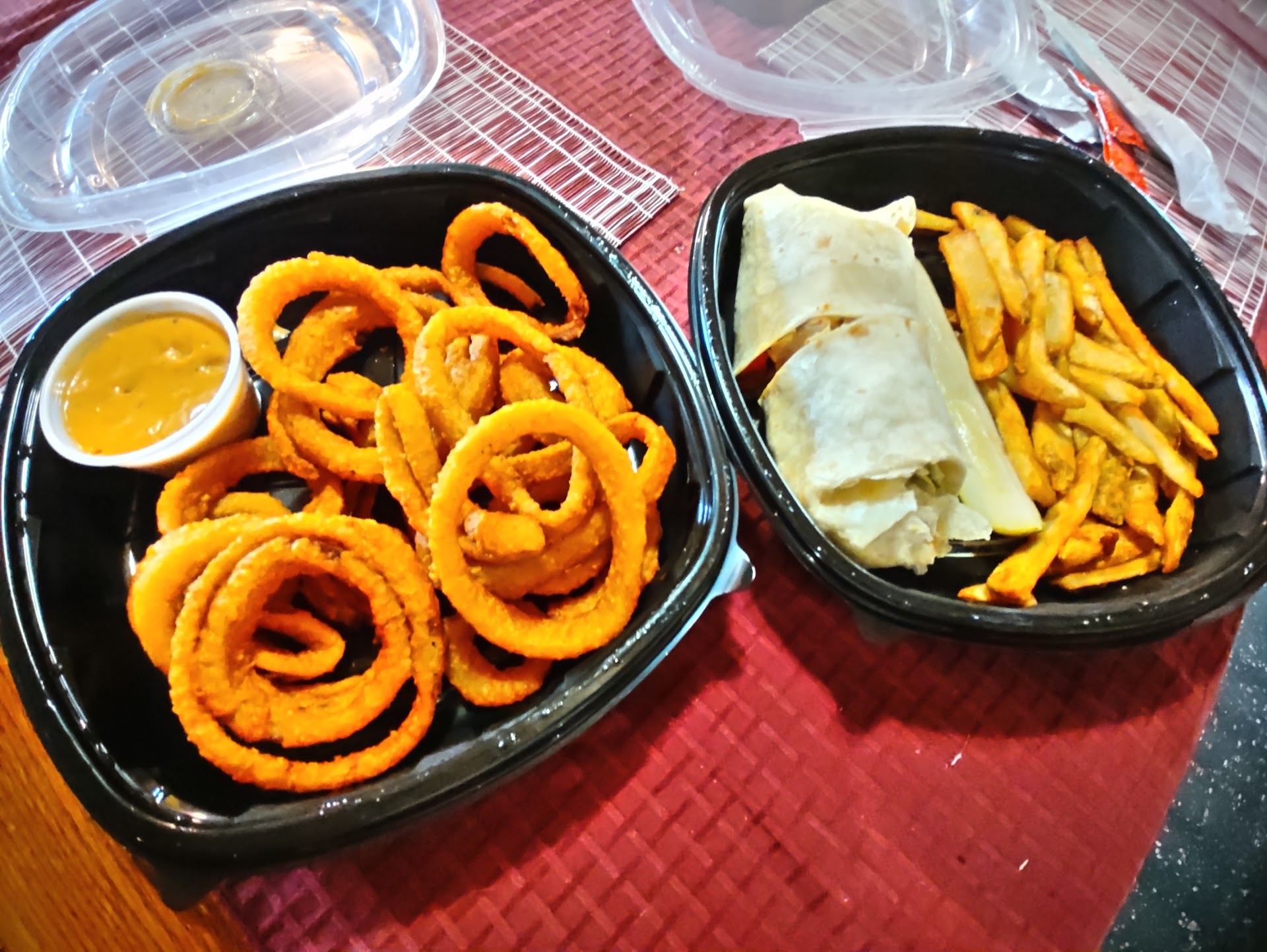 My order was for an appetizer portion of the Beer Battered Onion Rings and a Chipotle Chicken Wrap sans the Tomatoes with the Beer Battered French Fries. The onion rings were phenomenal, and went super well with the Cajun remoulade that is included. So darn good, and I do love me some onion rings. The wrap was also pretty wonderful, it held together really well, the chicken was slightly blackened and a nice hit of spice from the chipotle sauce. The fries were a little on the softer side compared to what I enjoy, and the pickle was way saltier than I was expecting. But, I was very satisfied with everything. Bare in mind I do have to travel 30+ minutes to get home from here, so the food was a little on the cooler side, but that's a me problem.