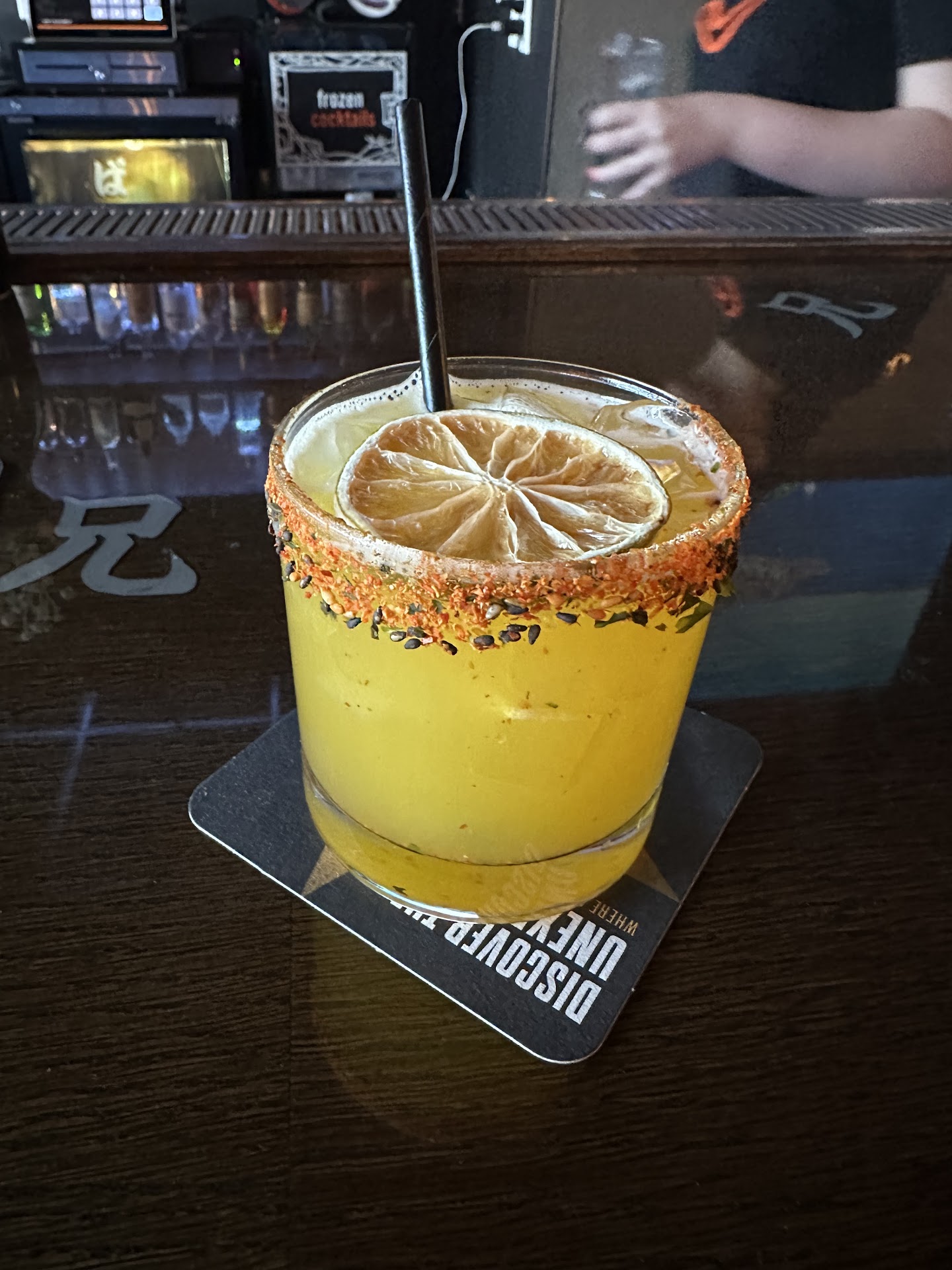 The scene is this somber night in the Japanese lights. Itâs a cool vibe and nice aesthetic. I enjoy the Japanese feel of the wall art and the moody lighting in the bar.
