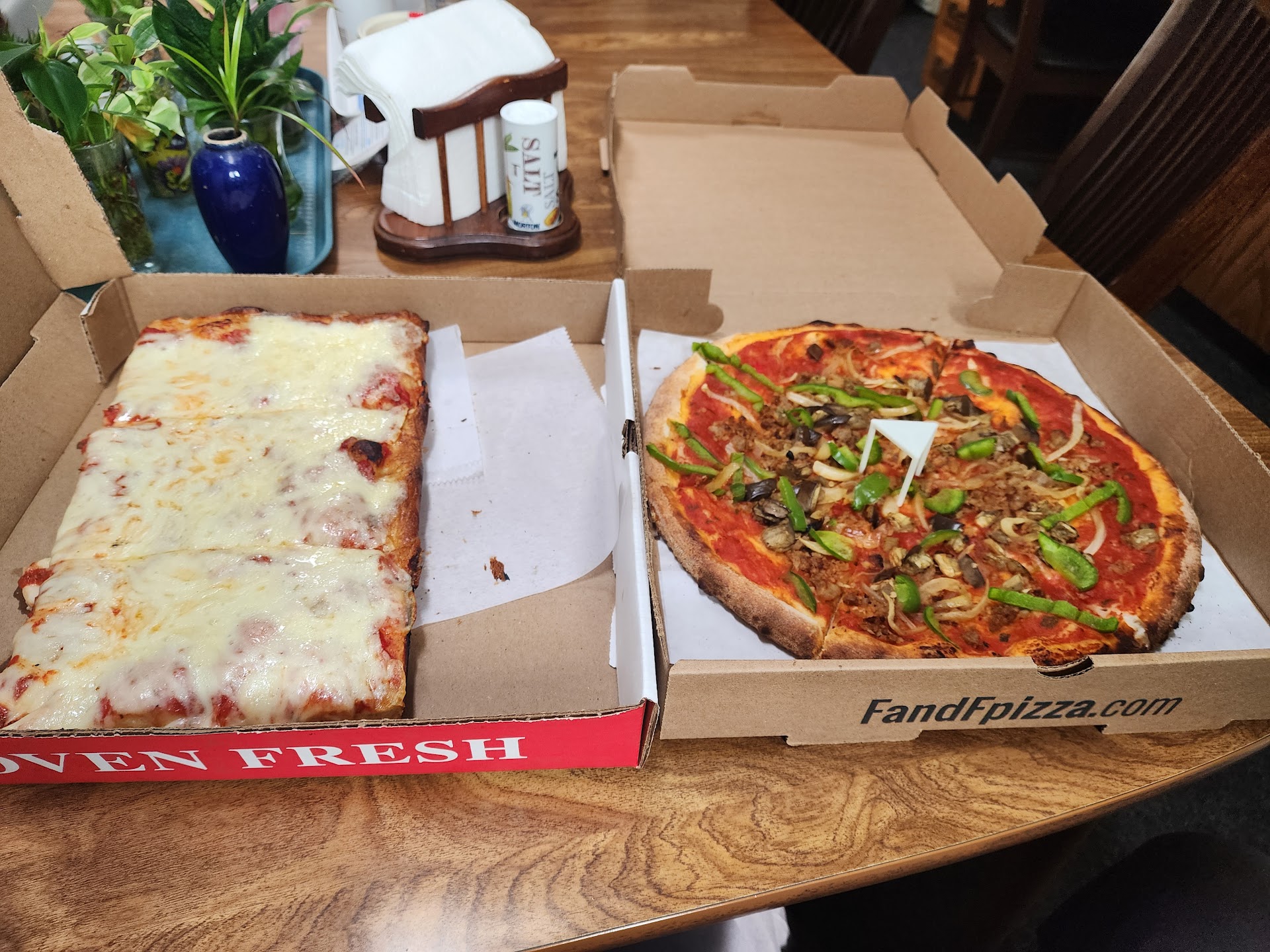 Ā Ā Ā Read moreI was visiting the area with my brother and decided to order pizza. We opted for some Sicilian slices from the place across the street from F&F and we chose F&F due to location and because they could offer a cheeseless pizza that also had no cheese in the pizza sauce - something he needed and I just had to try.