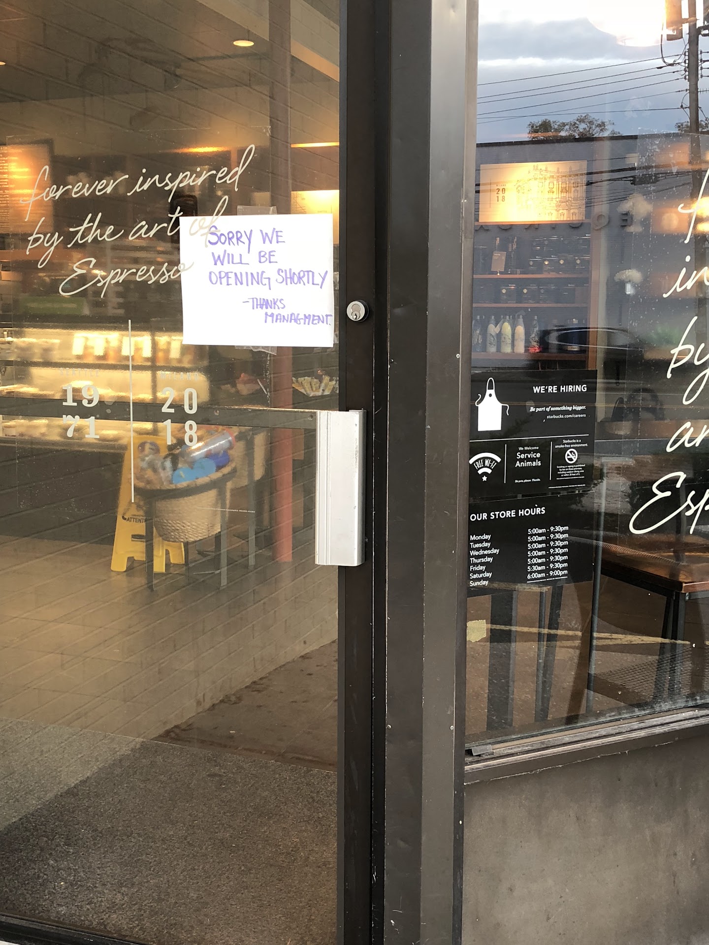 P.s I ended up going to Dunkin’ Donuts and had to pass the Starbucks again at around 8ish and the sign was still up and people were standing trying to open the door and of course it was locked... NICE WORK!