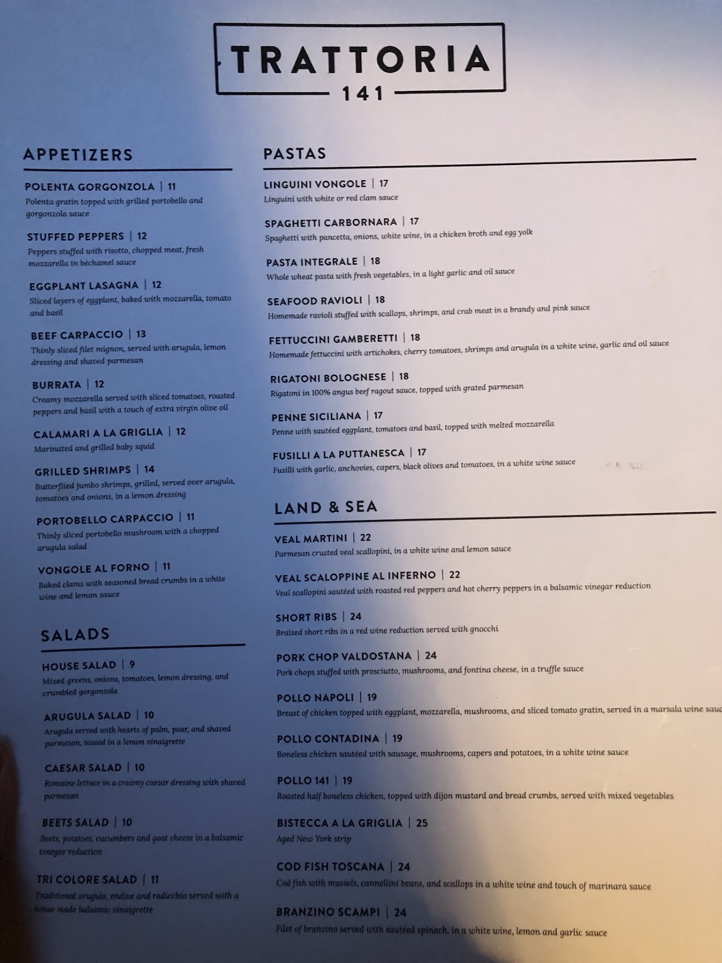 Read moreFirst time visiting Trattoria and we were pleasantly surprised by the overall quality of the food. Crab cake, salad, seafood ravioli, and eggplant lasagna were all worth ordering again. The short rib and gnocchi was a bit bland relative to other dishes. Desserts were also well executed and classic italian. The service was extremely good and was reminiscent of Michelin star restaurants given the level of care and mastery of the menu and specials. Would happily return again given...