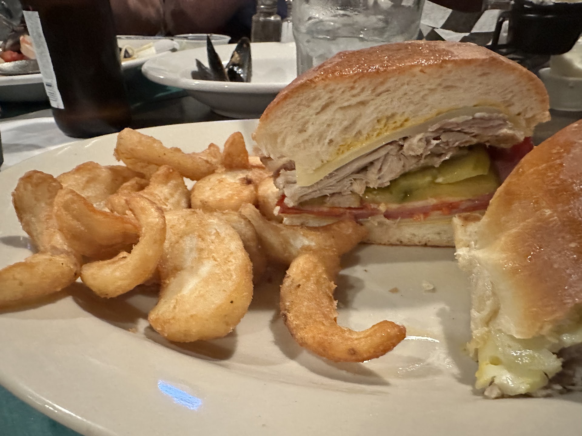 We hadn’t been here in years but 4 of us went for dinner this evening. Made reservations for 4 of us when they opened at 4pm, for 6pm, and they were pretty busy when we arrived. Got a comfy table in a corner and a friendly server, but we all missed her name as it was a little loud in there, or maybe just hard to hear for some reason. One of us got the Friday fish fry and it looked good and she reported it was delicious. Nice big hunk of fish, the smashed potatoes looked awesome, and a small cup of coleslaw. I got the Cuban sandwich with “fries” and oh boy was that good! You don’t see that in the menu too many places. And the little French fry things were very different but seasoned nicely and I ate them up quickly! Hubby and his dad both got the Seafood Fra Diavlo- dad with the spicy marinara as shown on the menu, and my husband requested his with Alfredo sauce instead. And they both RAVED! Huge plate of linguine and then I think they had like 6 clams, 10 mussels, 3 BIG scallops, some calamari tubes, 3ish shrimps and 3 teeny 🐙 ! They were very happy and full. We also ordered appetizers - fried calamari which 3 of them shared and very plentiful (nobody liked the flavor of the pickled stuff that came with it, but the calamari itself was great I guess) and also cheesy garlic bread which there were 8 nice pieces of with sauce. Plus free fresh bread and whipped butter. 👍🏻 The servers all were hustling as it was busy but we were happy with our service. And the prices were very reasonable for the quantity and quality of food we got. 👍🏻👍🏻👍🏻👍🏻 from the 4 of us and...