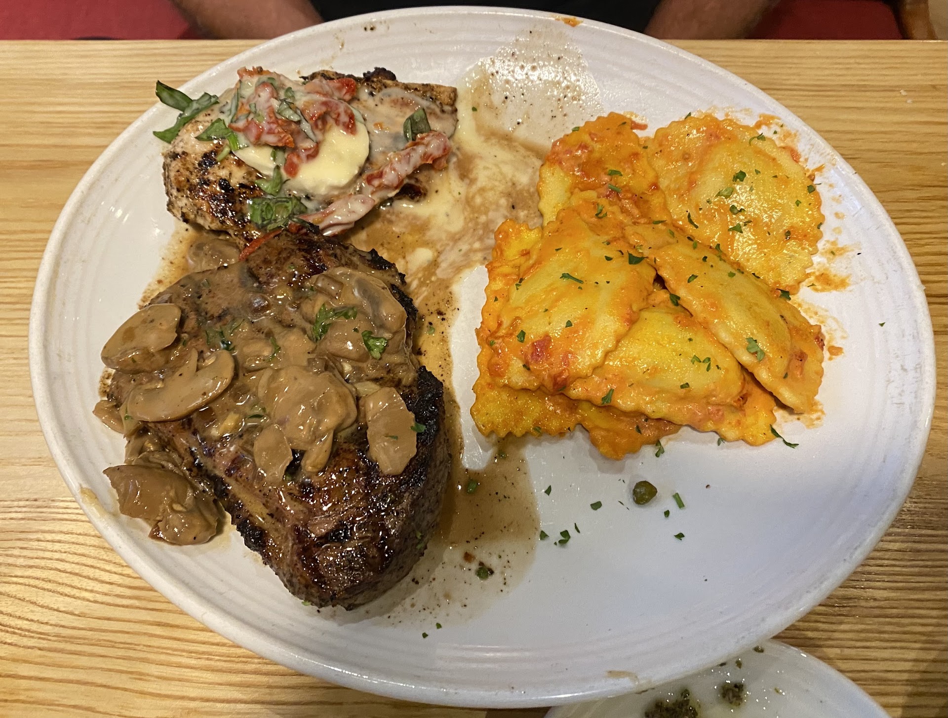 The Italian Classic Trio: The chicken Parm is one small chicken breast, not very crispy crust, tasted ok... The Alfredo was tasteless, and the pasta overcooked. Pasta more resembled thin egg noodles rather than linguini or fettuccine and was mushy. Then, the lasagna. I had 2 bites, the second just to be sure, but, it was bad. Not only was it the size that you may feed a kindergartener at lunch time, it was just plain gross. Way overcooked lasagna noodles, awkward sized chunks of what looked like sausage but was probably ground meat, all covered up in a bright red marinara sauce and decorated with micro-shredded, plastic looking cheese that didn't have much to add... Her dish was ok, same pasta though. Altogether it was a disaster and a swift kick in the pants for almost $200 with a tip. {Yes, still tipped the server, they did their job and need their money too} It should have been less than half of this amount...