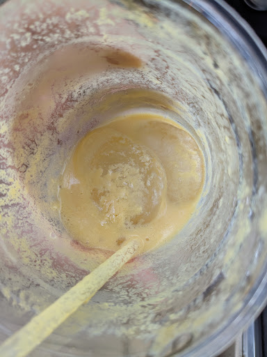 He wore green scrubs and sat at a tall two top.