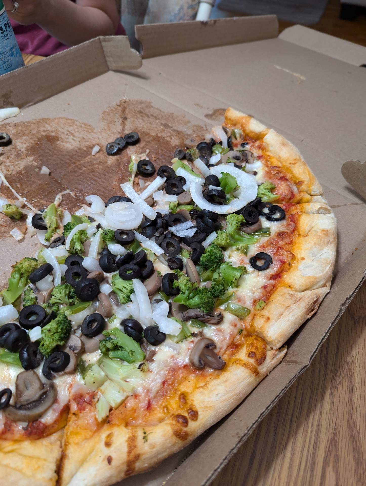Read moreVeggie pizza wasn't what we were expecting - see photo. It was heavily loaded with very-lightly-cooked onions and olives and mushrooms, and steamed broccoli. No bell peppers. It was a generous amount of all of these toppings, thoroughly burying the cheese, about as deep as the crust was. The toppings were bland and unseasoned and seemed to have been steamed or boiled, and weren't the crispy/roasted texture we...