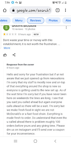 C) perhaps if you yourself were working at the time the review was posted you would have seen there was no long line. In fact a 'line' only accumulated when your staff made everyone wait to pay for their order all at once... And if you were working at that time, then wow. Just wow.