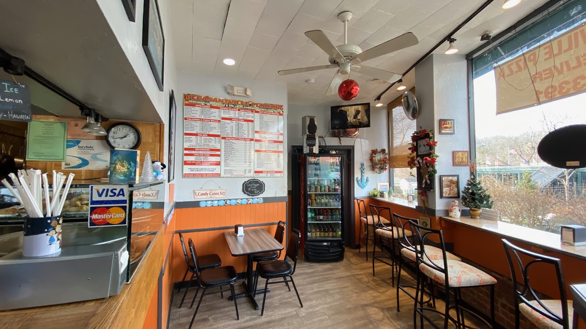 Nice regular NY style thin crust pizza and good calzones. They only have 3-4 individual slices and mostly sell whole pies (at $20 ish a large pie, 25+ options). Friendly staff, good amount of indoor and outdoor seating.