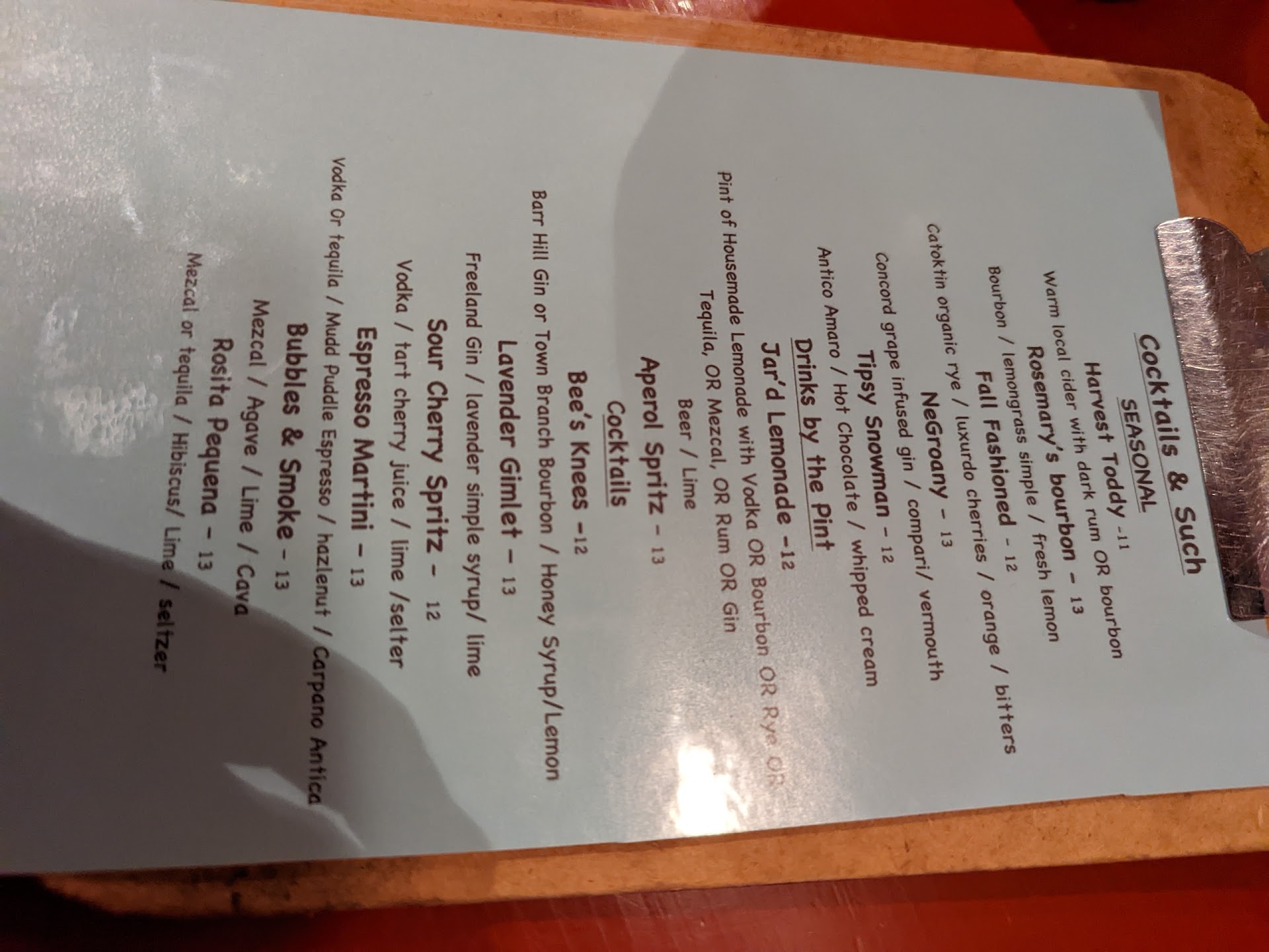 Cute place...loud but we could have a conversation. everyone seemed to know each other and the bartender was great...Russell has a tipsy snowman and it had to be pointed out to him that his mug was a naked lady torso (marry a nerd 🤓🥰). He said it was quite tasty ... Too sweet for me. I had the fall fashioned and bees knees both of which I liked a lot...I preferred the bees knees between the two...it got better as I drank it. One disappointment is the pics on Google show some dessert items but they don't serve desserts ... Just small plates.