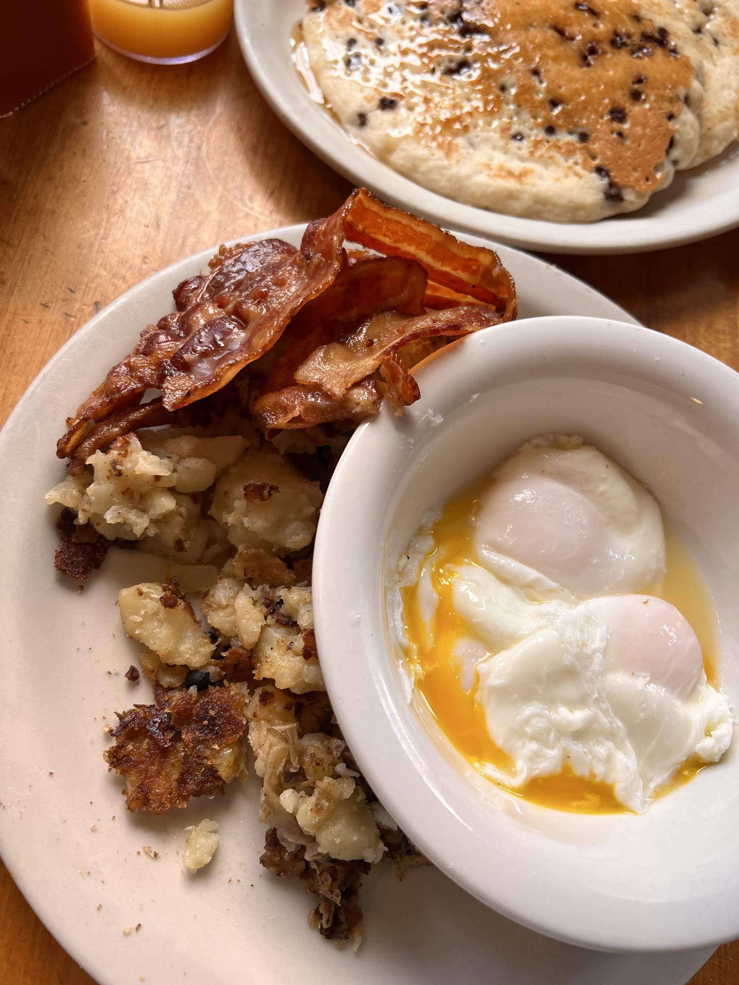 After much deliberation, I got The Trailblazer which is: two poached eggs, crab cakes, andouille sausage & tomato on an english muffin topped with a chipotle & roasted red pepper hollandaise & scallions. Served with home fries. I was pleasantly surprised that the crab cakes were not too fishy-tasting, which in my opinion, means that it probably good quality crab. The eggs were overcooked for this type of dish (yolks fully cooked) and they offered to re-do it, but for the sake of not wasting food I just decided...