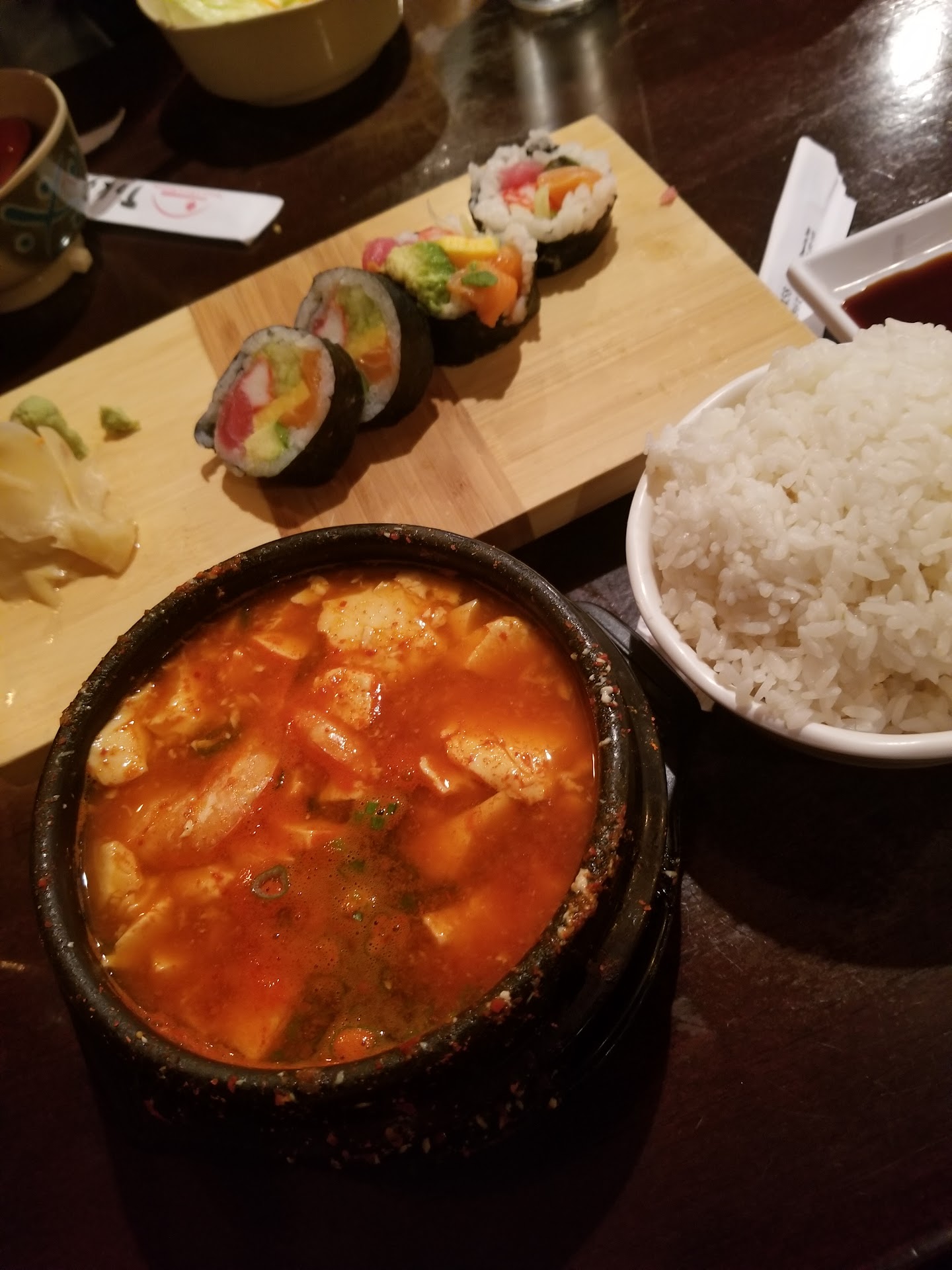 Read moreAbsolutely great for the cost. Not fancy - but you'd be crazy to expect fancy for these rock bottom prices. Very solid predictable American-suburbs-generic sushi with decent fish, good complimentary miso soup and korean style side salad. The Korean food was an unexpected surprise! Happy with the sundubu jigae (spicy tofu seafood soup) on a cold rainy day. Much more "generic" and "white people friendly" version than some sundubus; only has a goguchara, tofu, and a couple of shrimps (some sundubus can have a lot of seafood and be very 'fishy'.) And so cheap! Two entrees and a 375 ml bottle of sake for $40.
