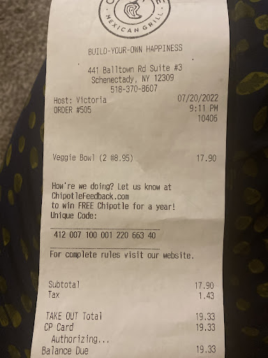 Ā Ā Ā Read moreI work and live near Mohawk Commons, and used to go to this Chipotle all the time. Last year, I noticed the quality started to decline. The guac wouldn't be mixed very well so you'd get some very spicy bites and some bland, the chicken would be unseasoned, etc. Disappointing, but nothing unforgivable. Then I noticed the portions started to go down. Pretty frequently, especially for online orders and especially for my wife (who gets fewer ingredients than I do), the bowl would end up half empty. Then they started to consistently make mistakes in online orders. Sometimes it would be small, like forgetting sour cream, but sometimes it would be totally wrong. With covid, I've only wanted to do online orders so I can be in and out, so I stopped going. A friend in my pod, however, still has us order from them once or twice a month. Despite the frequent trips, I don't remember the last time they gave us a fully correct order on the first try. Last night was the last straw, when I told my friend I was refusing to come back here. The food arrived more than half an hour after it was supposed to, and wanted to get home, I foolishly hustled out without checking. It turned out they gave us someone else's order. I called them up about a replacement, and they told us they would put us at the bottom of the queue and I would have to wait another half hour. I chose to get a refund instead.