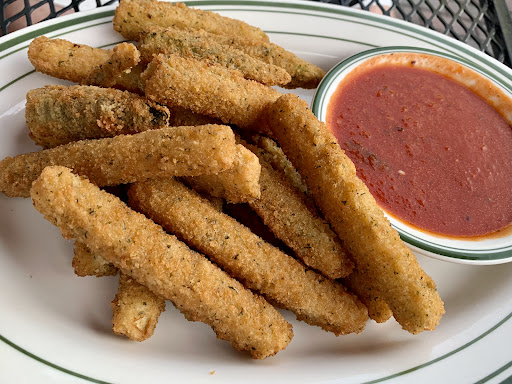 This was RJs hometown pizza place which closed about 10 years ago. He told me the story of how his father flew back to town just to get the last pizza before they closed. The same family recently reopened Andy's and we wanted to check it out. We made reservations but didn't need them the night we were there. It was a holiday weekend and no one seemed to be in town, so great for us. Hannah was our server and we sat outside in the front. She was super friendly and attentive. We didn't see there was also a really cute seating area out back until we were leaving. We started with fried zucchini and ordered a pizza half plain and half sausage and peppers. NY pizza is the only pizza I have seen where the sausage is slices instead of chunks. I love it like that! The sauce for the zucchini and on the pizza was really delicious, and the crust was perfect. We took half home and it was even better the next day. RJ said it was just as he...