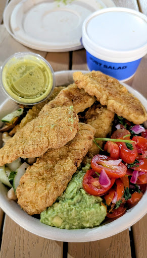 I tried Just Salad for the first (and probably last) time tonight through Too Good to Go. They gave me a bowl with white rice, sweet potato, black lentils, a tomato and cucumber salad, and 6–7 crispy chicken tenders. They also added guacamole, which was probably the best part of the whole meal. They only gave me dressing because I asked for it, and they included a small chicken noodle soup on the side.