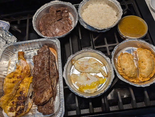 My wife and I had ordered a grilled skirt steak with rice and eggs, 1/2 chicken and grilled beef ribs with rice and beans, and beef empanadas.
