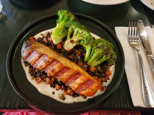 Pretty and relaxed restaurant. Mediterranean menu with a twist/flair. Specials everyday. Ours were interesting and sounded delicious including the Watermelon gazpacho. Service was excellent. Not a long wait for the food. Food was served hot and was delicious. Tuna Crustini was slightly spicy with crunchy toast and fresh tuna. The flavors contrasted and was excellent. The veggie burger made with quinoa and lentils was very tasty. I don't like a mushy veggie burger. Despite this flaw (it was crunchy on the outside) I finished it because it tasted so good. Grilled salmon on a cauliflower cream with lentils was cooked to perfection. Fish was flaky and tasty. The vegetables were excellent. My cousin's wife had a salad and said it was one of the best she has ever had. I recommend this restaurant highly. Missed 5 stars because that is saved for those out of this world savory...