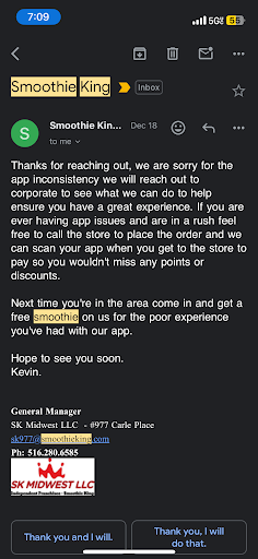 Read moreVery poor customer service. I ordered through doordash for Keto Berry, this was for my boyfriend. I understand its through a 3rd party where I ordered from. However I called Smoothie King just to ask what they would recommend or if the smoothie I ordered was popular. The girl told me No and that the Mango Kale smoothie is really popular. I kindly asked to have to switched if possible, i asked if they can make a one time exception. She said she wouldnt be able to and thats shes basically the shift manager. Then after I asked again , she then said that she was going to do it for me. Then I got a call and she said that she spoke to HER manager and that they told her No. why? The drink I had originally ordered was more then what the other drink was so what are you losing? It’s sad and this is my first time ordering Smoothie King and will be my last. The manager or general manager , you should really take into consideration of customer service and what made sense in the situation. Horrible...