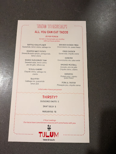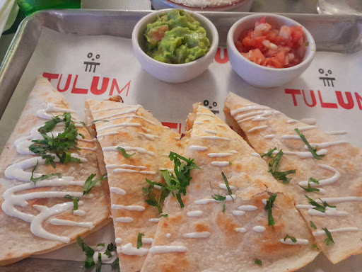 Ā Ā Ā Read moreFinally got to try the new restaurant in town Tulum! Inside youāll find a Modern concrete sleek look with a touch of Mexican fiesta colors. We started of with the baby corn and yucca fries apps. The baby corn was ok itās their version of Mexican street corn, it had a sour cream lime ācreamaā sprinkled with their queso fresco. The Yucca fries were great they were crunchy yet tender with a side of their chipotle ketchup and yellow aioli, I favored the aioli but itās also good eaten with both sauces mixed. For our main course we got the Barbacoa tacos, the skirt steak tacos and the five cheese quesadilla.The Barbacoa tacos came with pickled onions queso fresco and cilantro, meat was very flavorful and tender I must forewarn you that these tacos are very small like the size of your palm and their so good youāll just want more! But there are two things that Iām not sure if it happened by accident 1 these tacos came basically cold the tortillas were definitely cold and the meat on them were lukewarm and 2 there was no cilantro on the tacos. The skirt steak taco came on a sizzling cast iron skillet (I forgot to take a pic before we ate it) with four very nicely warmed 4inch tortillas served with pico, sour cream, and salsa and a side of your choice we picked guac, this was another favorite being it was served very hot and the meat was very tender and nicely seasoned. The five cheese quesadilla was also good it came with pico, sour cream, and a green sauce. Our dessert was churros and flan. The churros were good a little thick but still good it came with spicy chocolate which neither my boyfriend nor I could taste which was totally fine with us and a delicious salty caramel sauce which ended up being my favorite dipping sauce for them. The flan was outta this world it reminded me of my home made flan which hit the spot for me so it will always be a go to dessert for me. Overall we had a...