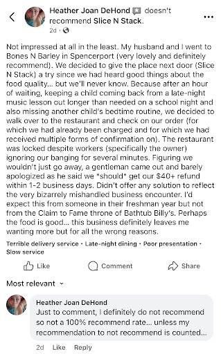 So, I cannot speak to the quality of the food since I never got a chance to enjoy my meal. My husband and I were waiting next door while our daughter has a music lesson when my husband put in an order through Slice N Stick’s web portal. My husband received multiple forms of confirmation that our order had been received and was in process. As a courtesy, the restaurant will supposedly deliver your food to your table at the brewery. This was placed at 7:27 p.m. At 8:15 p.m., now with a tired kid in tow and kids at home waiting for us for some late night grub, I asked my husband to look into the status of the order. It said it was still processing. We checked our checking and saw the money had been processed for the order out of our account. We waited about 10 more minutes until I ran out of patience. The staff at the brewery was helpful and offered to call. We all walked over together to see what was going on. Lights were on but the door was locked. We could see the owner through the window. She knocked and called twice with no response. So, I started knocking as well. The owner looked up and made eye contact with me before whipping his glance away as if he didn’t see me. I knocked louder. He finally came up and unlatched the door. We explained what happened and he was aloof with a flat affect. He did not acknowledge our frustration. He did not look at all apologetic for the hour we just wasted trying to support his new business. Instead, he placed the blame on his POS and said best he could do was refund us in 48 hours. Even told us he’d process the refund in the morning. Unhappy with my experience, I made a review on their Facebook page reflective of my account of said events. In the owner’s responses, he made comments that painted me as unreasonable, inaccurately lowered the amount of our check to seem as though I was hyperbolizing, and never once took accountability for his mishandling of an unnecessarily daunting experience. Wordage including, “I’m sorry you feel that way.” I was not abusive in my response but my disappointment was palpable. Then a third party, who coincidently has consistently and immediately jumped in on any social media post from anyone attempting to share a negative experience they’ve had with this establishment, chimed in to name-call and say I could probably stand to miss a meal anyway. I suspect that there is a tie there given this man’s passion for defending a new restaurant’s honor. If not, then it’s a bad look for an owner to see someone getting abused on their social media and not intervene. Then again, that’s the whole point of this review: The owner doesn’t care. Funny he had more time to block my husband’s Facebook account from interacting with the business (but strangely not mine… yet) than to make any prudent effort at all for customer acquisition...
