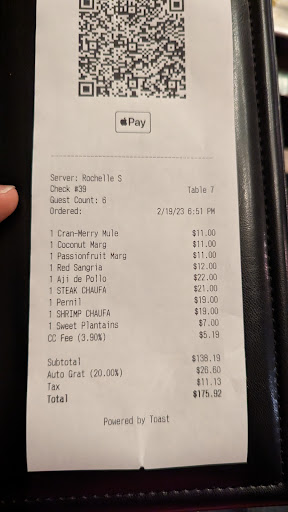 Went to properly have dinner and this is going to be my favorite spot for great Peruvian food. For drinks I had the Spicy Margarita Peru ($11). This was so delicious, I could have had two. Not too sweet and a little spicy. Taste of an alcohol infused fresh squeezed lemonade. Appetizers shared the Camarones a la Piedra ($14) Jumbo Shrimp on yuca and OMG! The bomb. The shrimp were perfectly cooked, the yuca was creamy yet firm with what tasted like anchovies laying on a sweet reduction sauce. Flavor bomb! For entree, I ordered Pollo a La Brasa ($21.99) with charred brussel sprouts a d sweet plantains. The rotisserie was probably the best I've ever had. I don't eat chicken skin and I ate the crispy skin. It was juicy and gently flavored. A beautiful meal from start to finish. And out waiter Kevin was amazing. See...