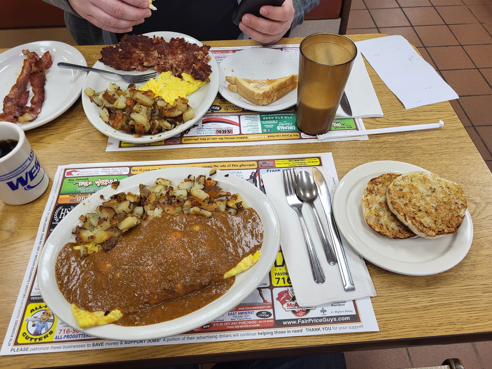 Love these skinny, steam rolled, fragrantly onioned slimmers. Each donut paper wrapped beaut is a small bite of heaven late nights watching some cheesy reality show. Breakfast choices are classic. Souvlaki Salad on a dessert saucer sized plate? I thought it was a joke at first, it's wasn't. I had to order the dinner to get a normal sized souvlaki salad. If you like your tomatoes and onions grilled for your salad? Forget it, you'll receive shards of both in total of 4-5 tops. I had to order 2 more sides of each to appropriate the dinner size salad. What part of ordering twice more didn't compute with the cook(s); seriously. I was annoyed but not as annoyed as I was by every waitress in the place offering and refilling all coffee cups literally every 3-5 minutes; tops. Holy annoying ones, huge evaluation and staff discussion needed beside the fact that they don't ask if you want a refill, they just fill it. (Just when you mixed it perfectly to😬) When your hand automatically covers your cup as you sense her approach........ I was really pissed off to be honest, trying to eat and have a conversation with the love of this girl's life. Take Away: Food is very classic diner-style basic but good, waitresses are friendly yet overly diligent to a fault &...