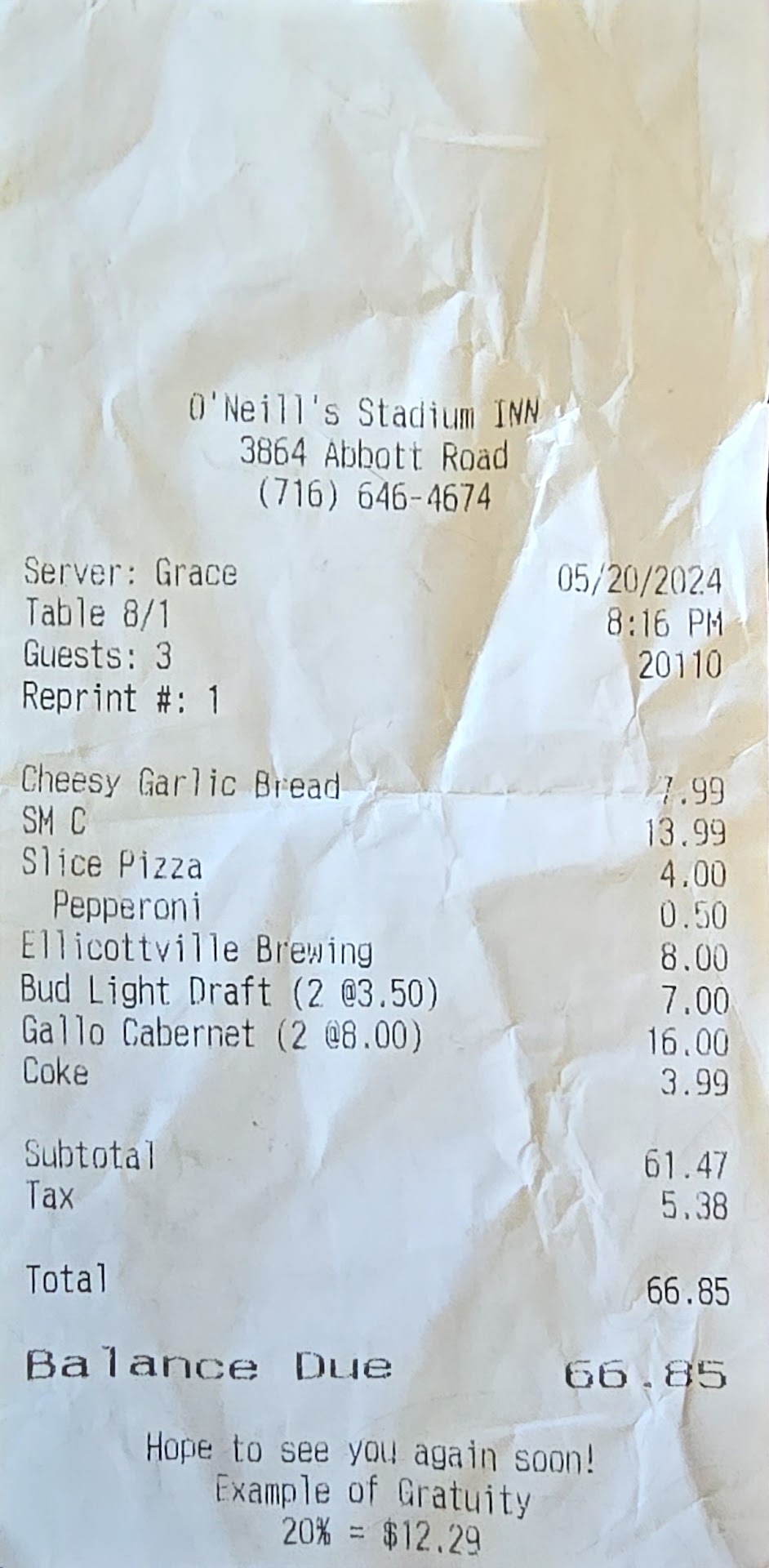 Be very weary of this place, I visited this establishment on a visit to a buffalo bills playoff game on January 19th. After paying for our food/drinks at the establishment (Paying on Jan 19th and the payment being posted on Jan 20th), 3 weeks later me and my friend each found a brand new and separate charge on our credit cards for a random large amount which obviously raised a major concern. Please be weary of providing your credit card to the employees.