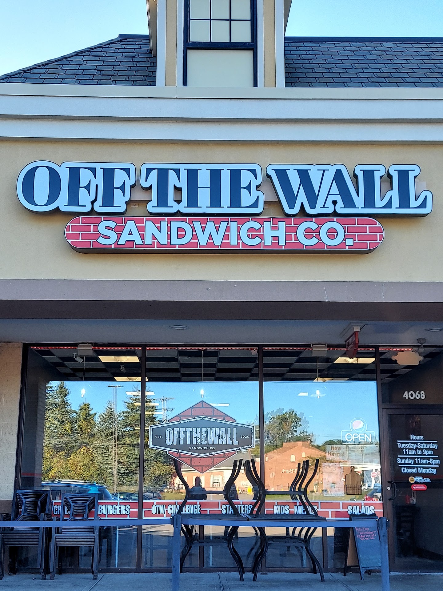 Cute little sandwich and burger place in a strip plaza in Orchard Park. Indoor dining is available, with sit-down meals, orders taken at the table by wait staff. We chose to eat outside because it was a nice Friday night and they offered wrought iron type tables just outside their door, under the covered plaza walkway. The view was just the parking lot, but that was fine. Prices are reasonable. We ordered 3 drinks, 1 appetizer, 2 burgers, and 1 sandwich. All meals came with fries/onion rings. They also offer tater tots but we did not choose that option. Total with 20% tip was just over $71.00.