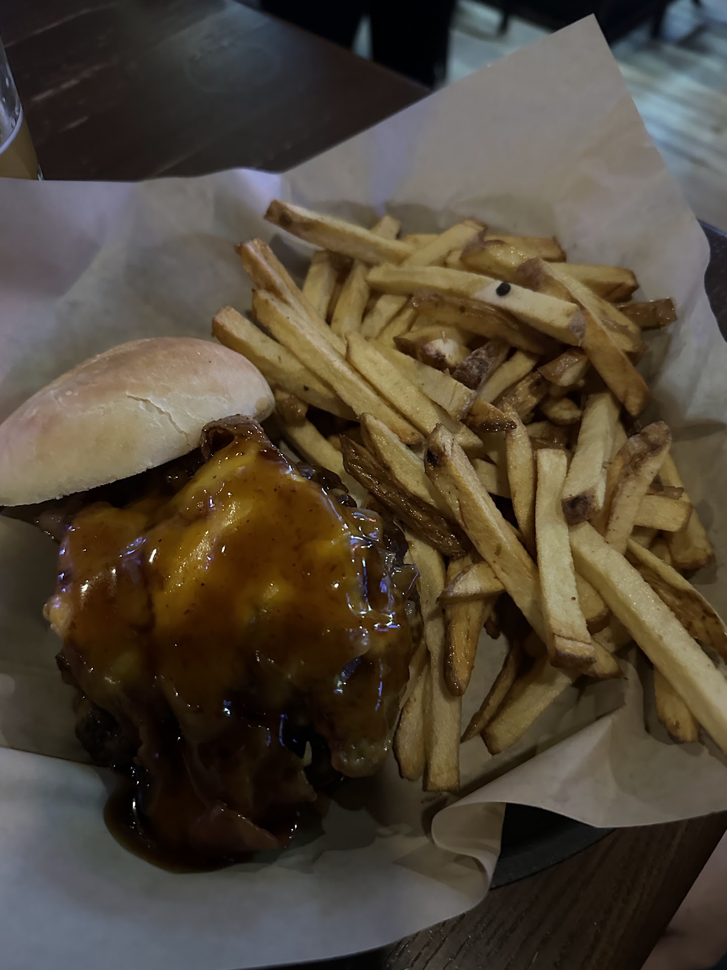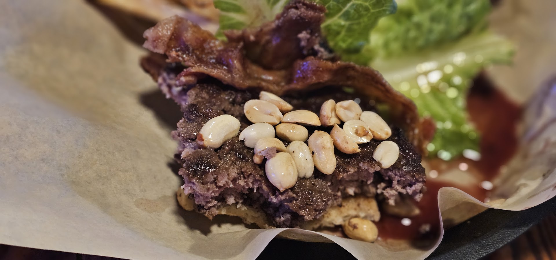 Read moreOrdered the PB&J burger. I've had many a burger from lots of businesses with their version of this burger on the menu. Of all of them, this one was the worst. Raw saltless peanuts was the only peanut flavor I noticed. They fell out all over the place, made for an annoying bite and I had to chew so much more before swallowing. Falsely advertising peanut butter. I mentioned to the bartender that the burger isn't really as It's described as and he said there is peanut butter in the jelly. There was a streak of melted jelly that mostly sat in the bottom of my tray. The bun was super sticky on the outside. The jelly flavor was a ghost flavor and licking my fingers gave me more jelly than the burger did. There needs to be a layer of lettuce between the jelly component to help reduce melting while also making sure the jelly is thicker and can handle this application. Honestly, the jelly was said to be a housemade sauce and it was nothing special. Completely disappointed overall. I also ordered medium rare and mine came medium when my friend wanted medium and got medium rare. The fries would good. Solid lineup on beers. Service on a slow Thursday with 2 tables and like 5 people at the bar was not great. Took a long time to get our drinks ordered and we weren't checked in on until 85% of our meal...