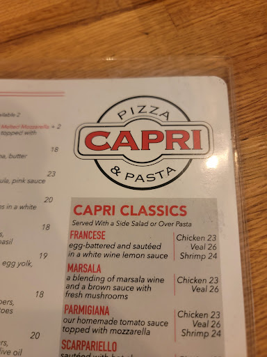 My husband and I decided to have dinner without the kids, but a fun date night, and we decided on Pizza, but we wanted something different as far as Pizza goes. I googled places nearby and Capri came up. I checked out the menu, which looks fabulous, but looks could be deceiving. We decided to give it a go. I live about 15 minutes out of Ossining, by the way. There is a dining area at this pizzeria. It's a very friendly and family oriented place. Our waiter was very nice, polite and pleasant the whole time. I cannot remember his name, and that was only because when he said it, sure enough, on cue, the kids were calling and I was distracted. The waiter brought us a "bread basket" but it was perfect Italiano bread with butter and olive oil with various olives and a piece of sun-dried tomato in it. The bread was nice and hot, the olive oil was so delicious, mouthwatering. We ordered buffalo wings for appetizers and individual pizzas for our entrees. My husband ordered a plain cheese and I ordered a chicken pesto pie. The buffalo wings, for me, were perfect. They were not drenched in buffalo sauce. The sauce itself was but a coating, that was good for me because I like to eat wings with a crispy skin and tender meat and these wings were perfection, very tasty. It's how wings should be made. Thinking about it makes me want more. My husband and I share food for tasting and the cheese slice was so good, the sauce that they use has the perfect herbs and right amount of everything. I wonder if they make their sauce. I hope they do, if not, it still tasted good. the chicken pesto was amazing. I had a Stella Artois to go along with my pizza, my husband had a soda and it felt as all was right with the world. The individual pizza is big. You will have leftovers. It worked out for us because we were able to take it home to our children and they enjoyed the pizzas as well. I highly...