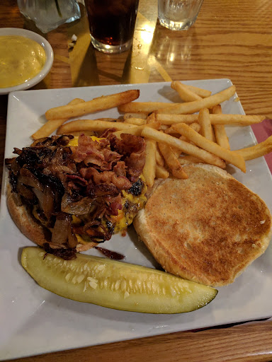 Now the food. I ordered a Bacon cheddar burger with fried onions "As rare as you can legally make it". This is always my sticking point. If you bring out a burger that is medium rare, medium, or medium well....you lose me. And that's what happened. My burger came out and it was medium at best. Not only that it was relatively dry. I've had burgers that came out medium but had high fat contents in the meat and thus still juicy. This leads me to believe that the burgers here are not hand made fresh chopped meat burgers and cannot be made rare. The bun was soft and fluffy but toasted which was nice. The fries were very good (steak fries basically, not my favorite) but the honey mustard was delicious and plentiful.